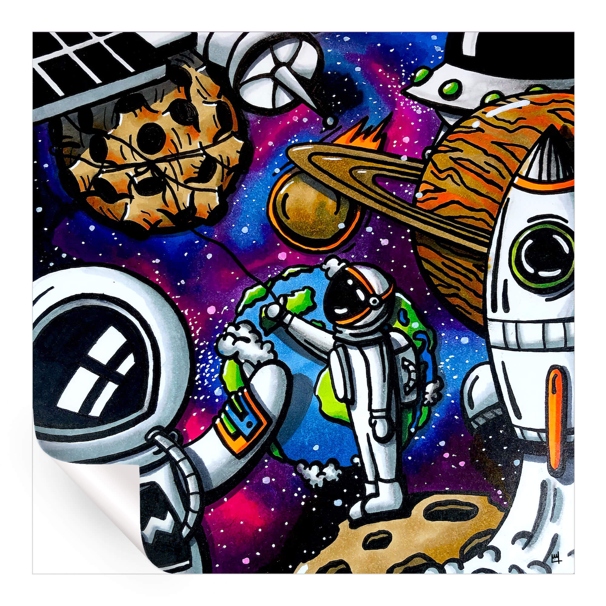 A vibrant space-themed piece shows two astronauts in a cosmic setting. One astronaut depicted is floating, tethered to Earth with a whimsical puff of cloud, while the other is playfully interacting with a friendly robot. Surrounding them are celestial bodies, including a cratered moon and planets, along with a whimsically designed spacecraft. The dark expanse of space is dotted with stars, enhancing the scene’s lively yet otherworldly atmosphere.