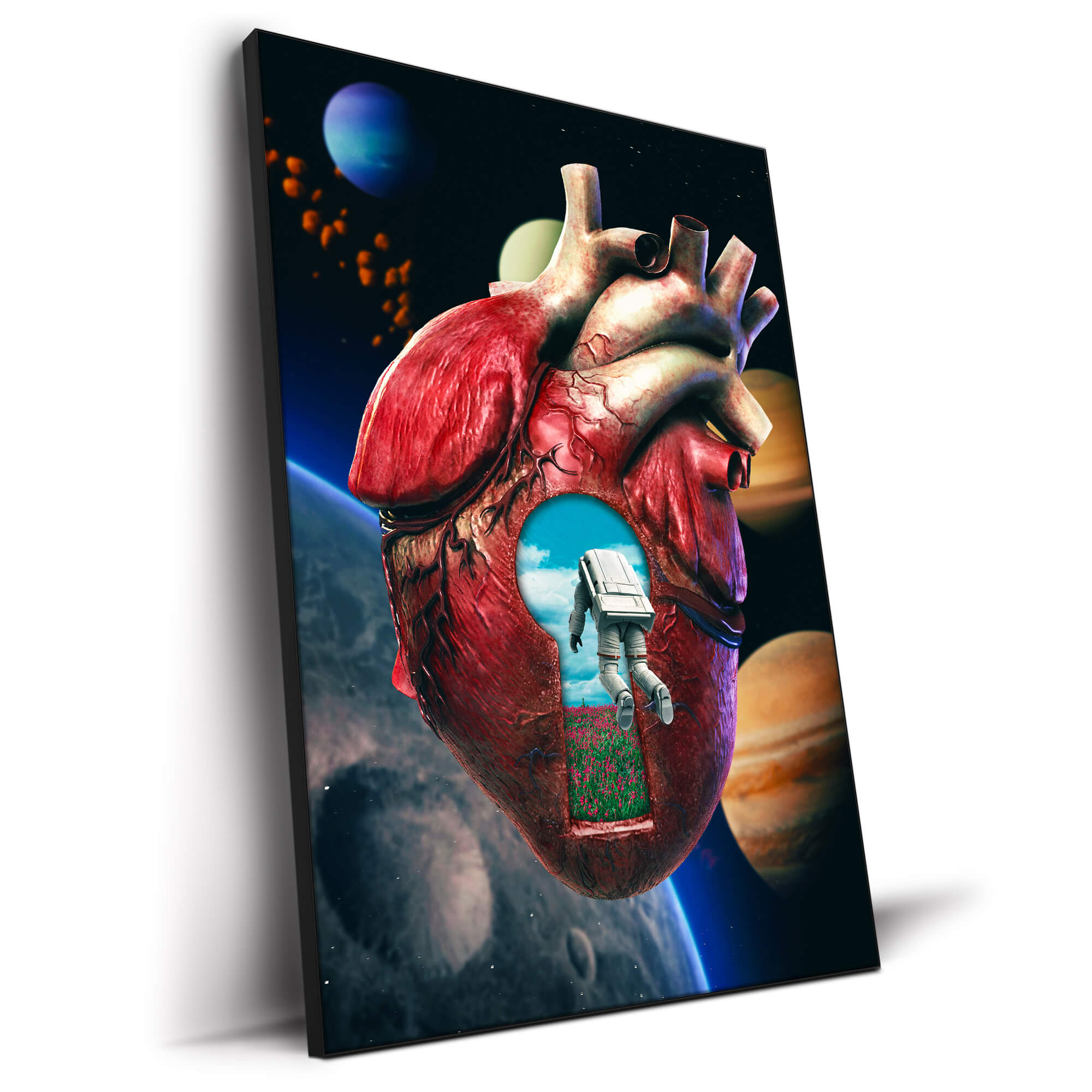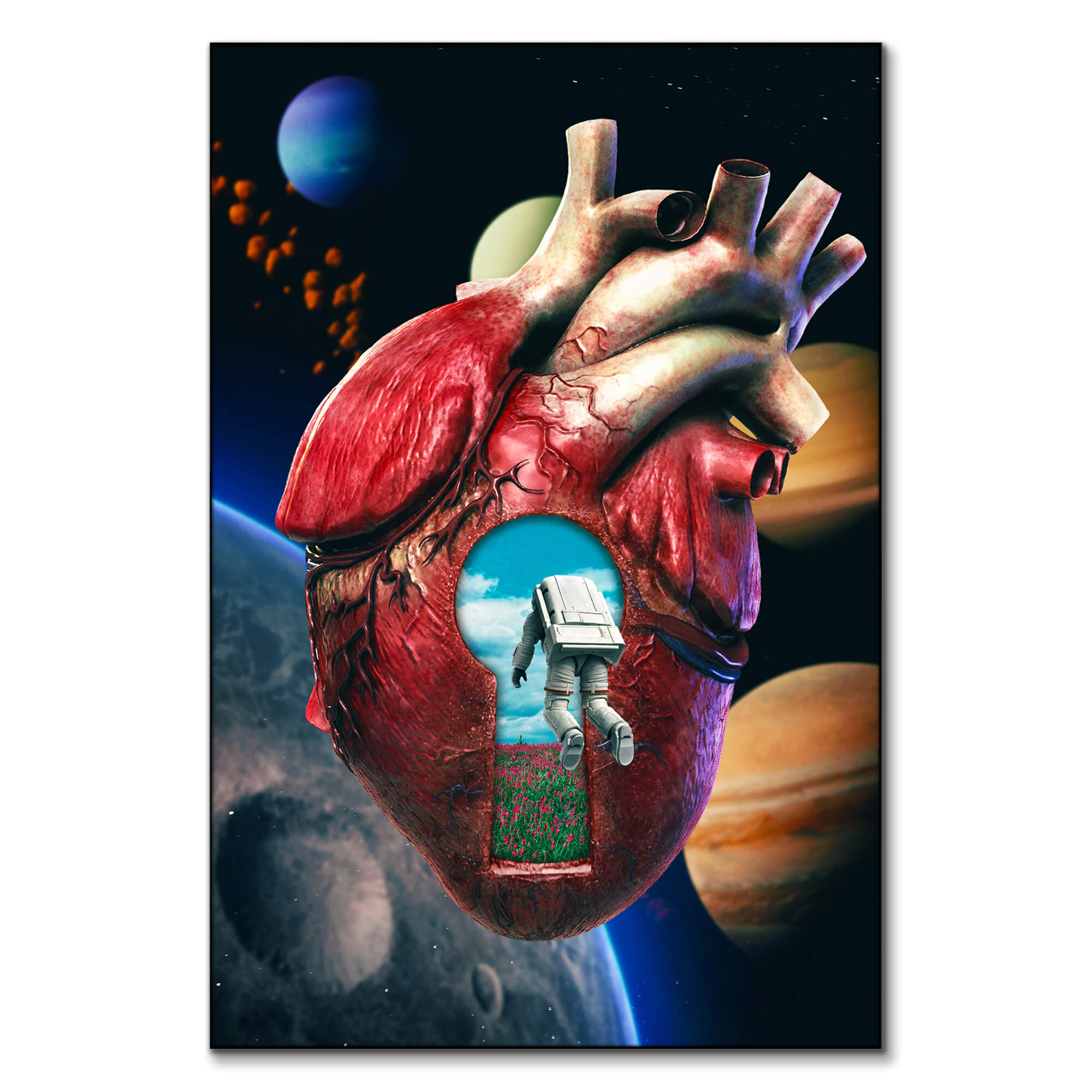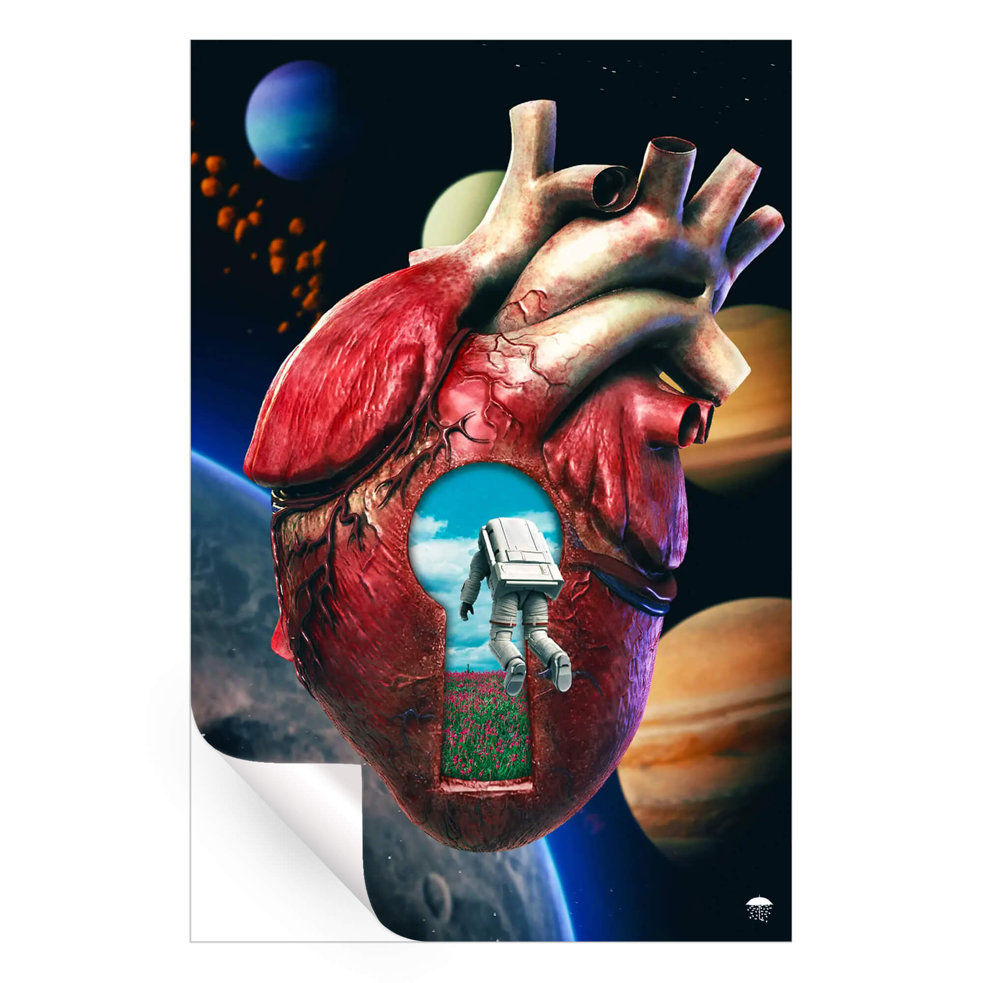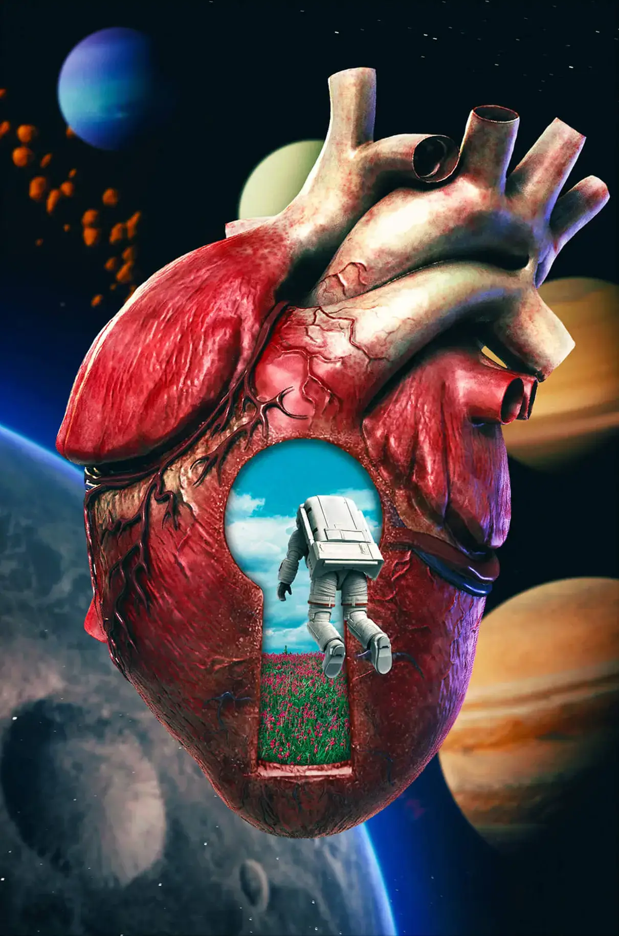 A giant anatomical heart floats in space, with a cutaway revealing a pleasant scene within: an astronaut, diminutive in scale, stands amidst a field of red flowers under a blue sky. The surreal image combines the organic with the celestial, posing the vastness of space with a tiny slice of idyllic Earth, encapsulated within the core of life itself.