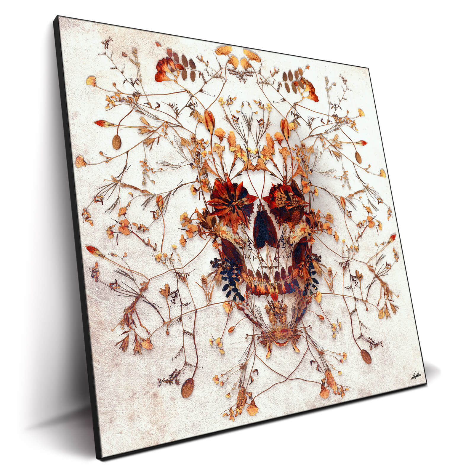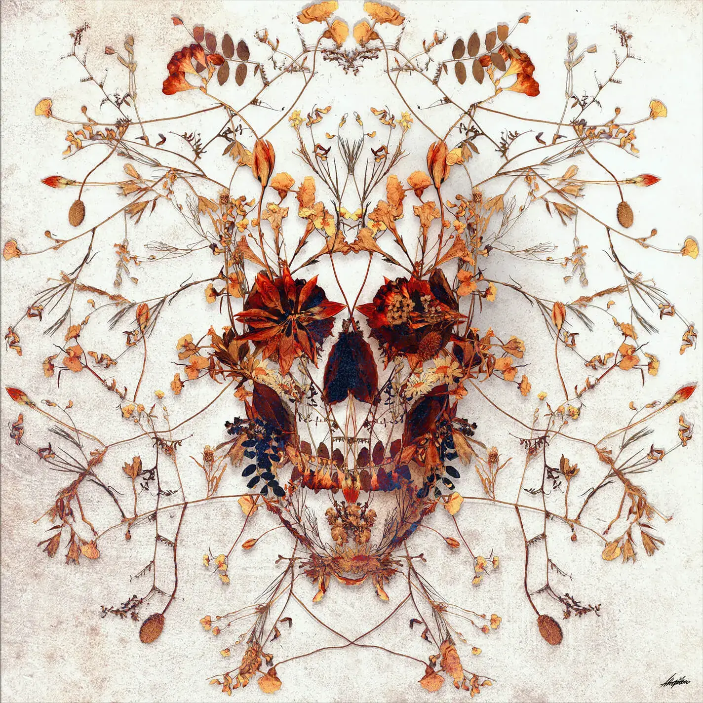 Dried leaves and autumnal flowers weave together to form a botanical skull, a celebration of the season’s final flourish. The delicate play of decay and beauty is captured in this still life, offering a quiet reflection on the passage of time.
