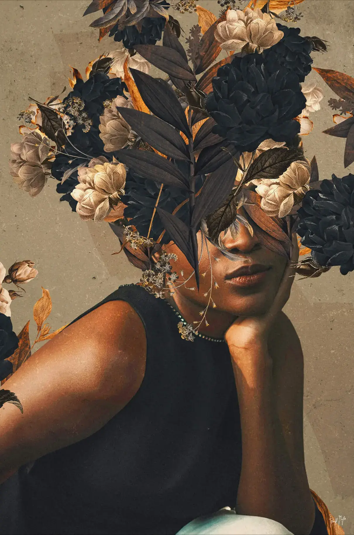 This artwork blends richness and emotion through color and texture. A woman rests her chin on her hand, surrounded by dark florals and autumn-toned leaves that bloom from her head in layers of depth and motion. The warm, brown palette creates a moody atmosphere full of intrigue and strength.