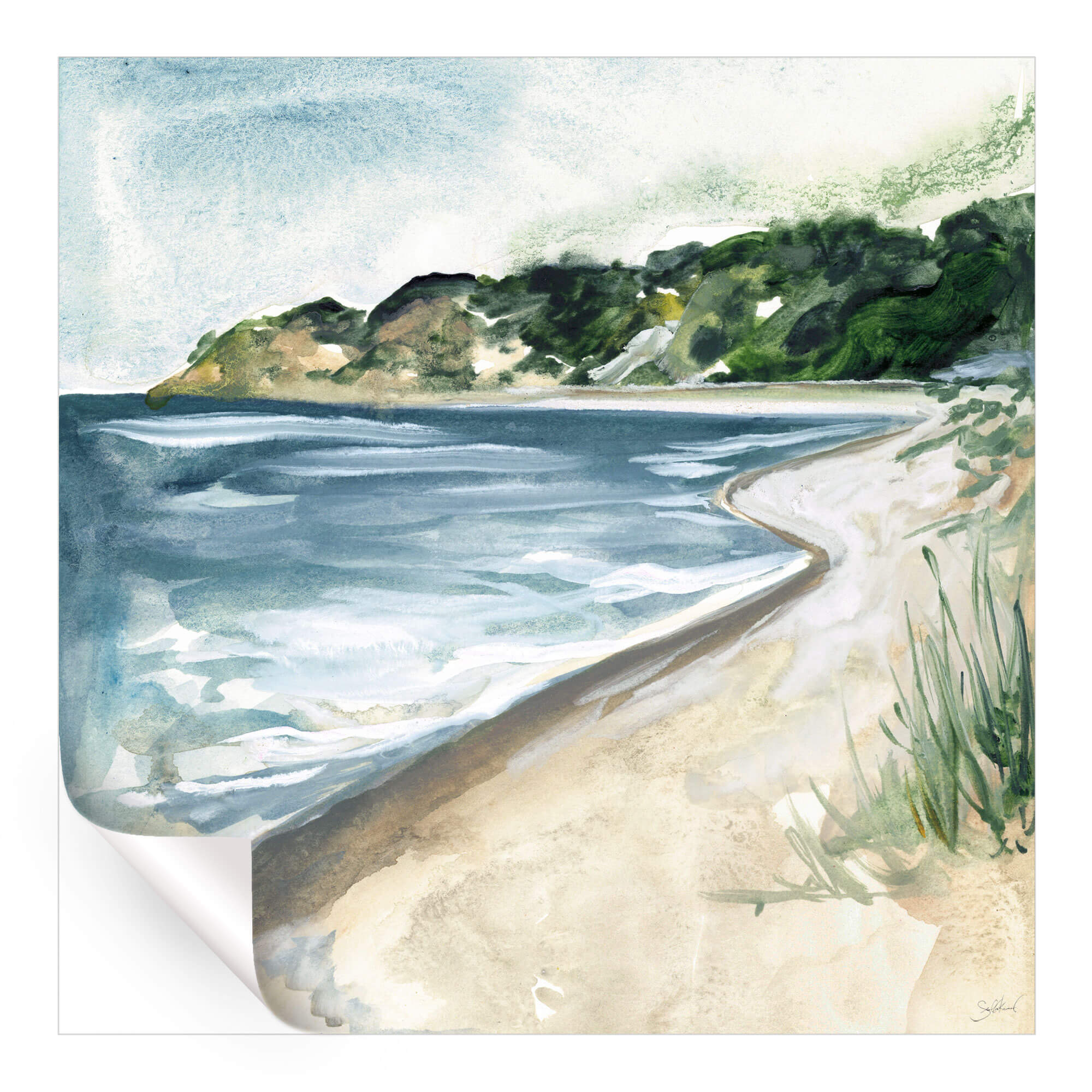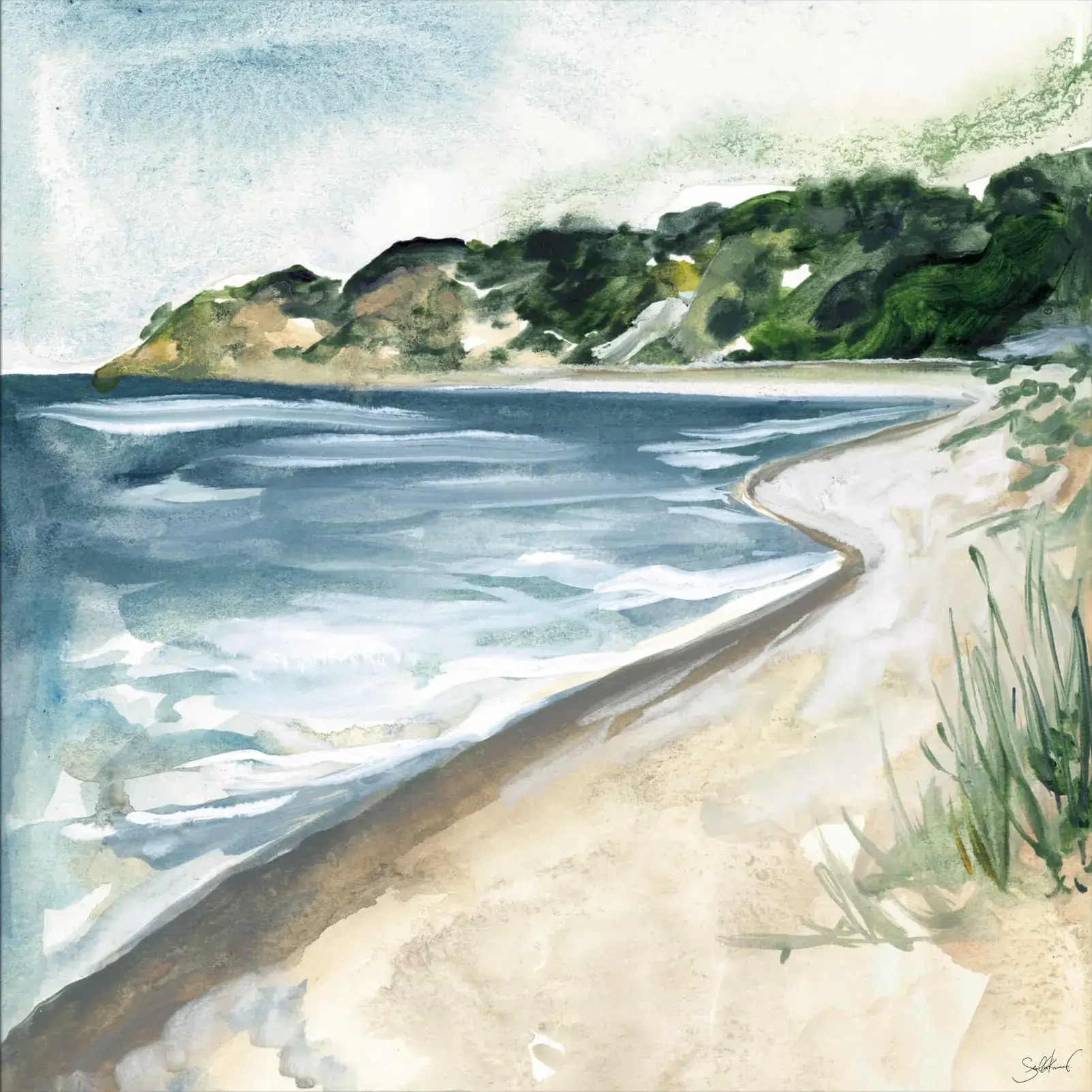 The image is a watercolor painting of a beach scene. It features a sandy shore on the right leading into the water, with waves coming in towards the beach. There’s a landmass or headland covered in greenery in the background. The sky above is painted with light blue and white, suggesting a clear day. In the foreground, there are some green plants or grasses at the edge of the sand.