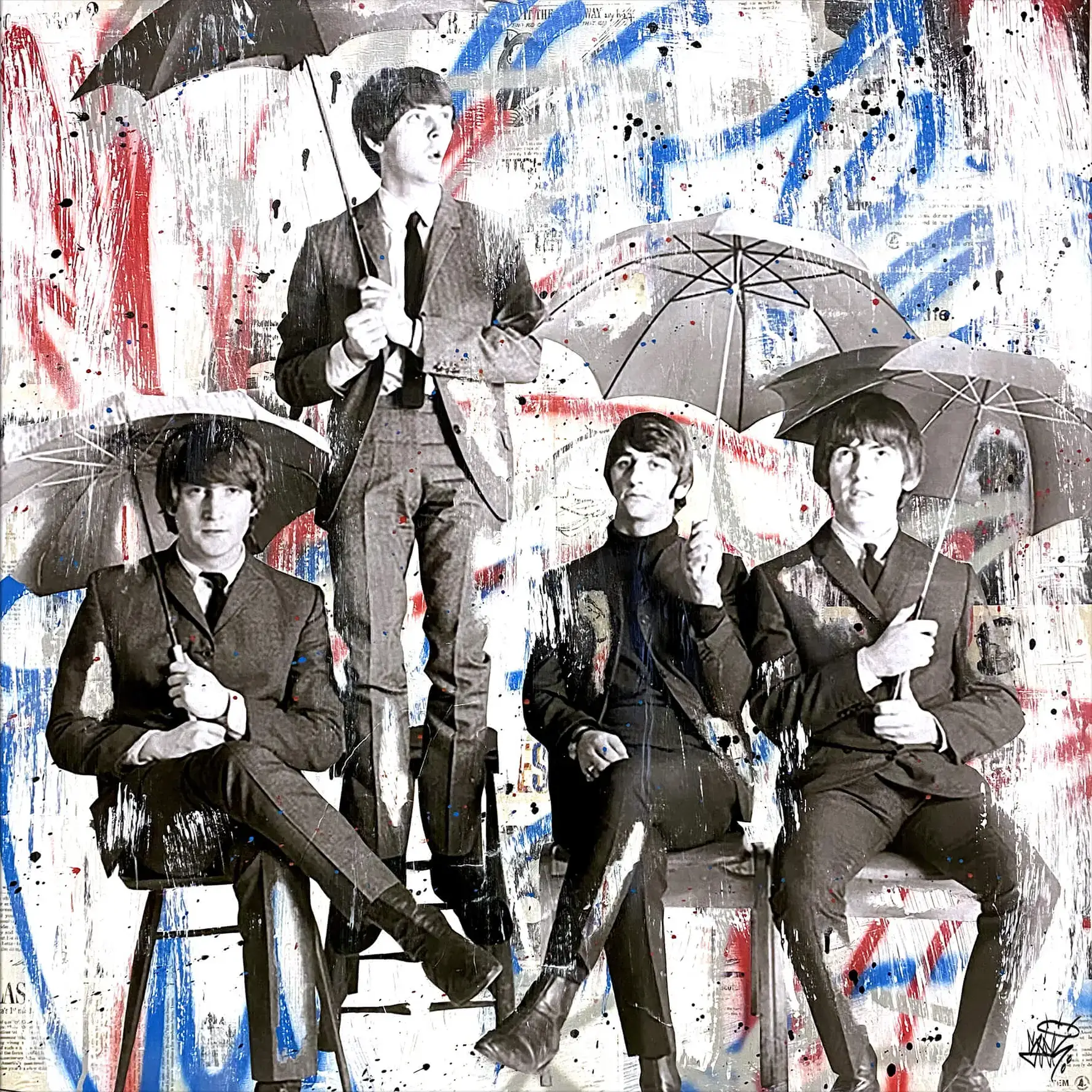 The Beatles are depicted in black and white against a splattered background of blue, red, and white paint. The mix of the monochrome classic photo of the Beatles with the vivid, almost chaotic background creates a striking contrast. The paint appears to be randomly thrown, with drips and splatters creating an abstract pattern around and over the picture, which gives the impression of movement and energy.