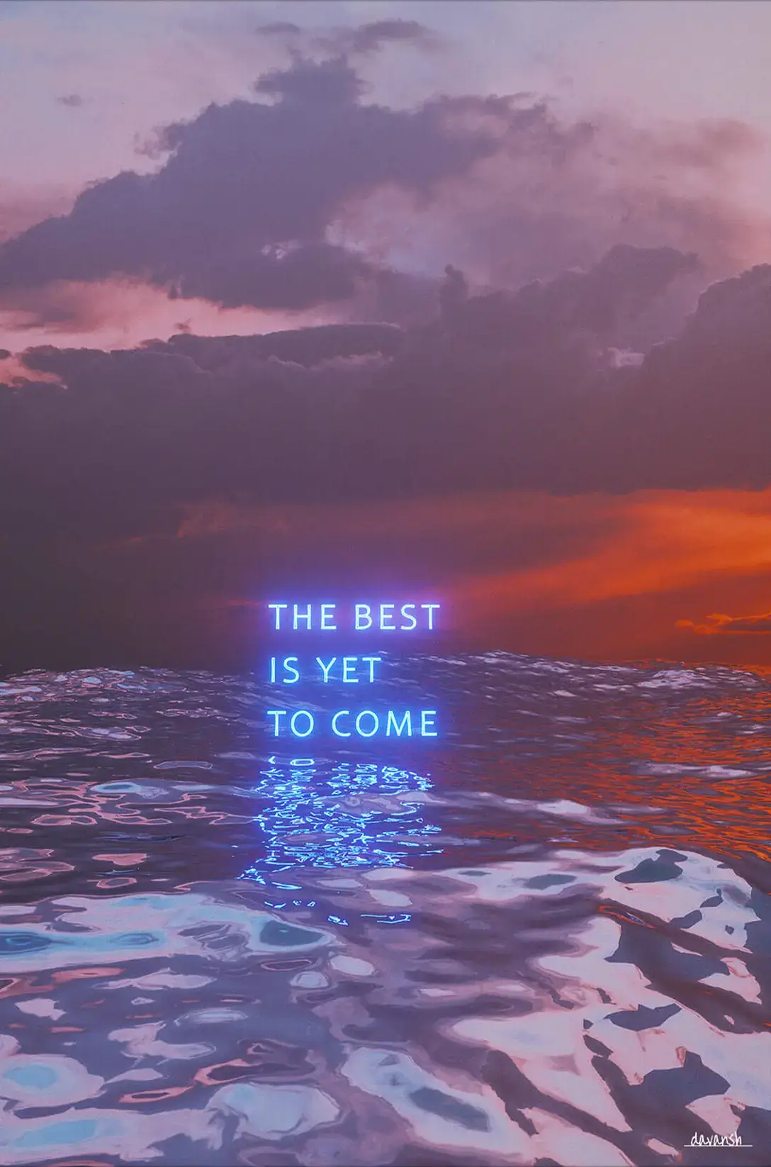 The image displays a serene seascape with a purple and orange sky at sunset or sunrise. Reflecting on the calm waters is a neon blue sign that reads “THE BEST IS YET TO COME.” The colors of the sky blend into the sea, creating a peaceful and hopeful scene.