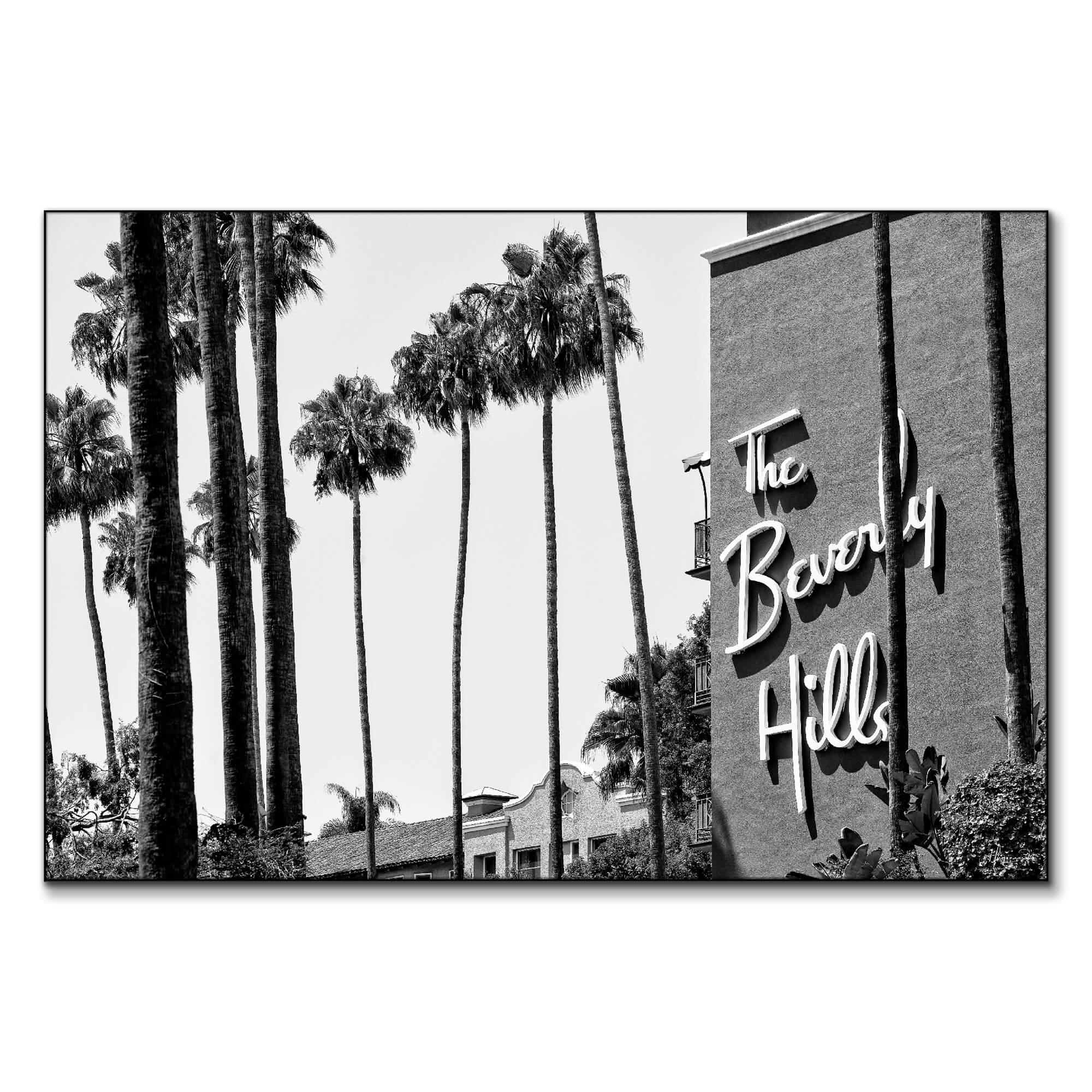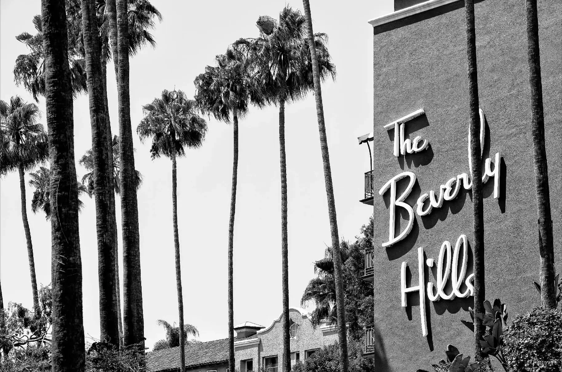 Capture the timeless elegance of The Beverly Hills Hotel, known as the iconic symbol of Hollywood’s Golden Age. Tall, slender palm trees line the scene, reaching skyward, framing the hotel’s famed signage on the side of the building.