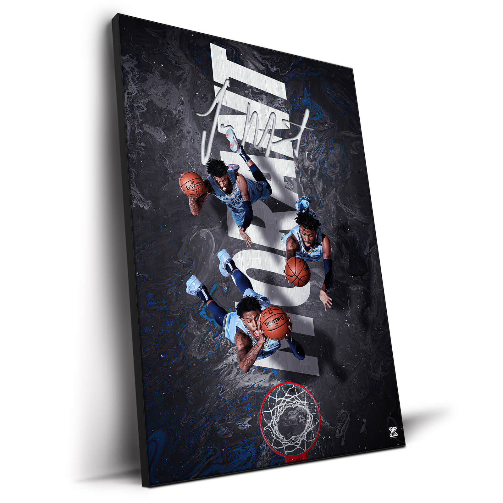 Suspended in a whirlpool of marbled cosmic-like hues of navy and shades of midnight, Jamel “Ja” Morant is depicted in a series of action-packed snapshots cascading toward the hoop.