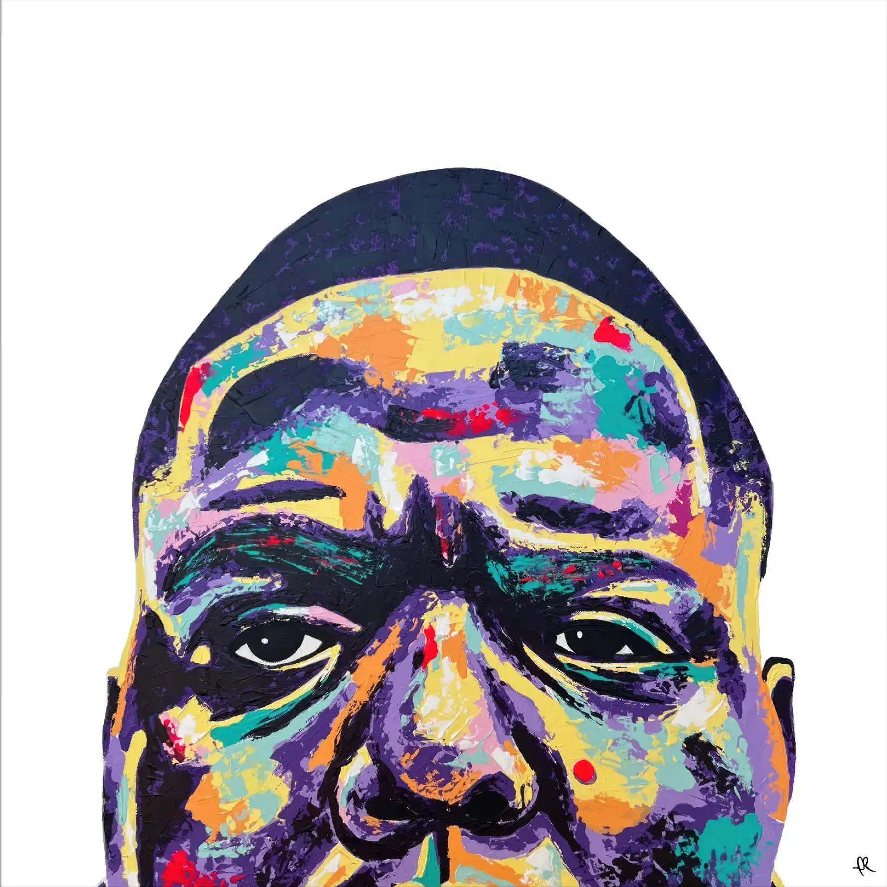 This Biggie hip hop isolated art is a colorful, stylized portrait of famous rapper Notorious BIG looking straight ahead.
