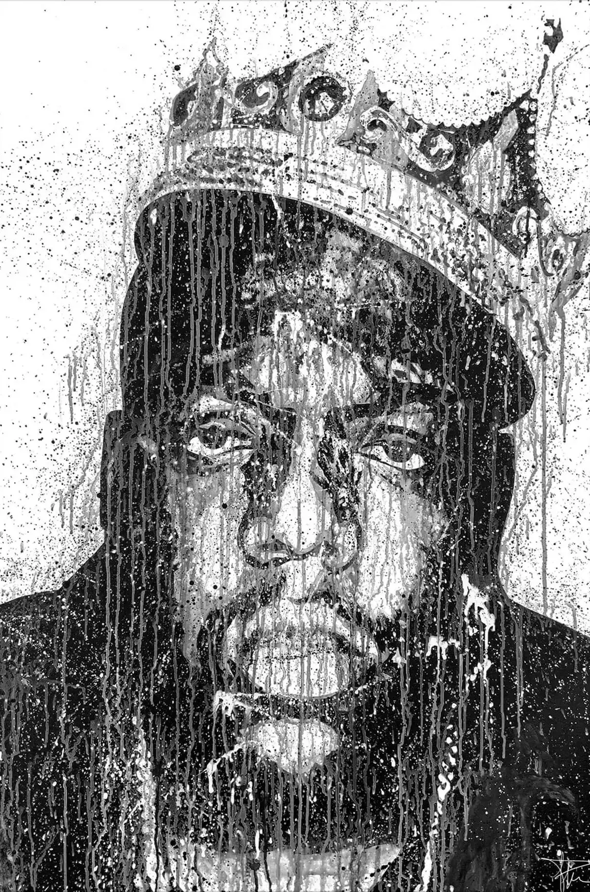 Set against a canvas alive with dynamic splatters, the stoic gaze of Biggie is immortalized in monochrome. The dripping crown atop his head serves not just as a symbol of his status but also echoes the flow of his influential lyrics that reshaped a genre.