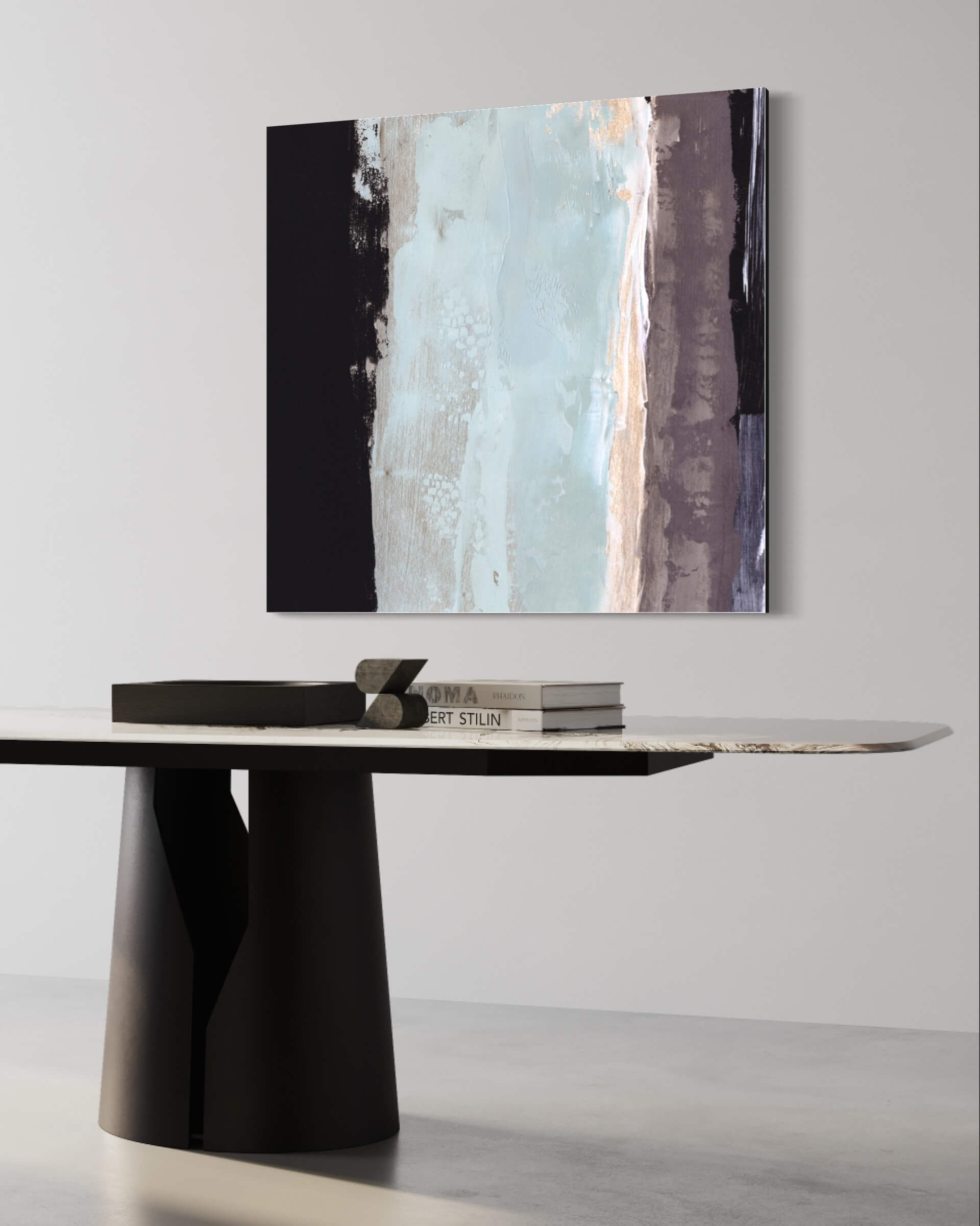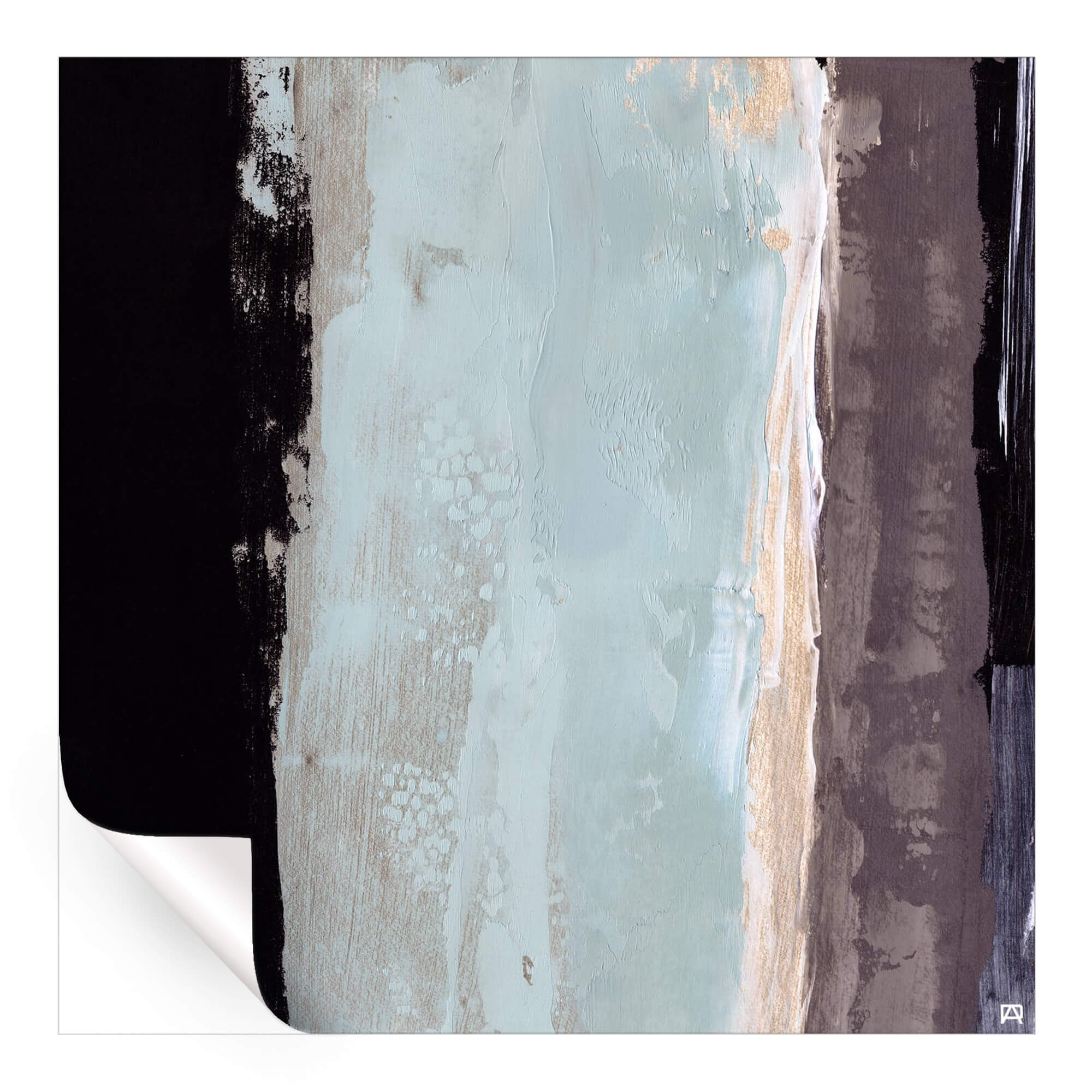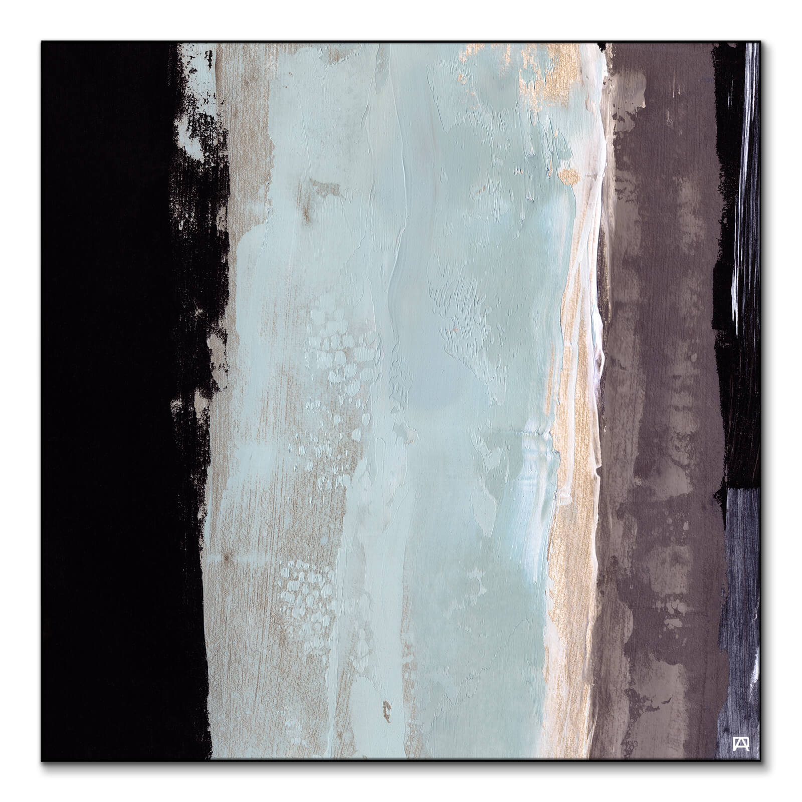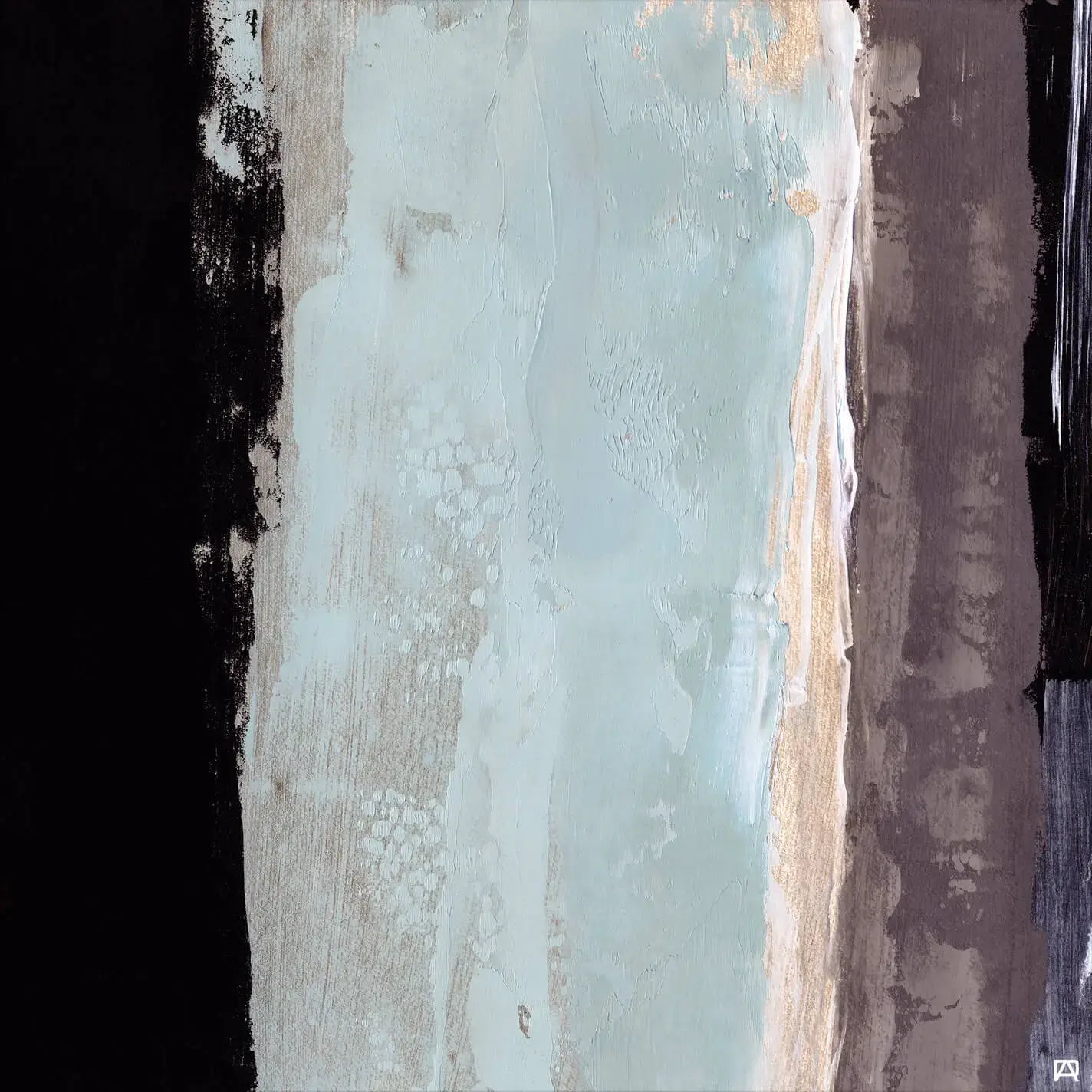 A thin strip of gold borders this area, which adds a touch of warmth to the otherwise cool palette. The far right edge contains a vertical stripe of brown, offering a balance to the black on the left.