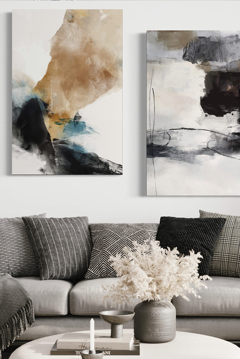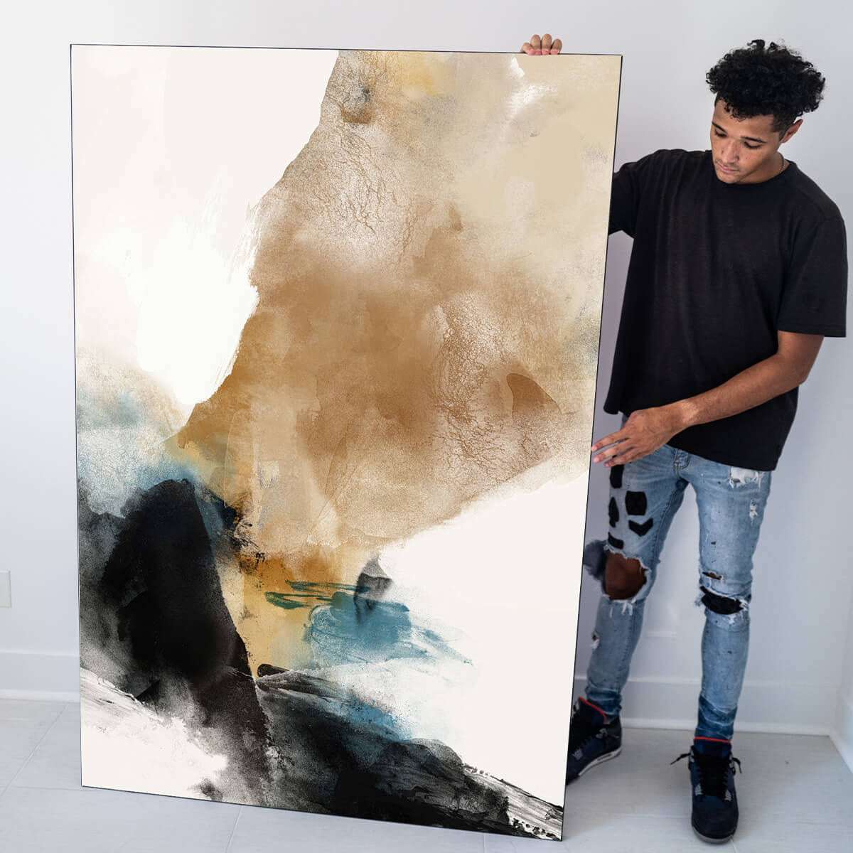 The vertical composition begins with bright ivory space that allows each mark to breathe. A warm beige field rises like weathered stone, its cracked texture revealing delicate veins and subtle tonal shifts. At the lower edge, a concentrated sweep of charcoal black anchors the abstract wall art and adds dramatic weight. Wisps of dusty teal slip between the dark and light passages, suggesting distant water glinting under spring sun. Fine splatters and translucent washes hint at mist, giving the minimalist wall art a sense of movement. The interplay of opaque and sheer layers feels spontaneous yet balanced. In another pass, faint ochre rings appear like fossil imprints, nodding to autumn’s dry leaves. The entire painting reads as a quiet dialogue between seasons, light, and shadow.