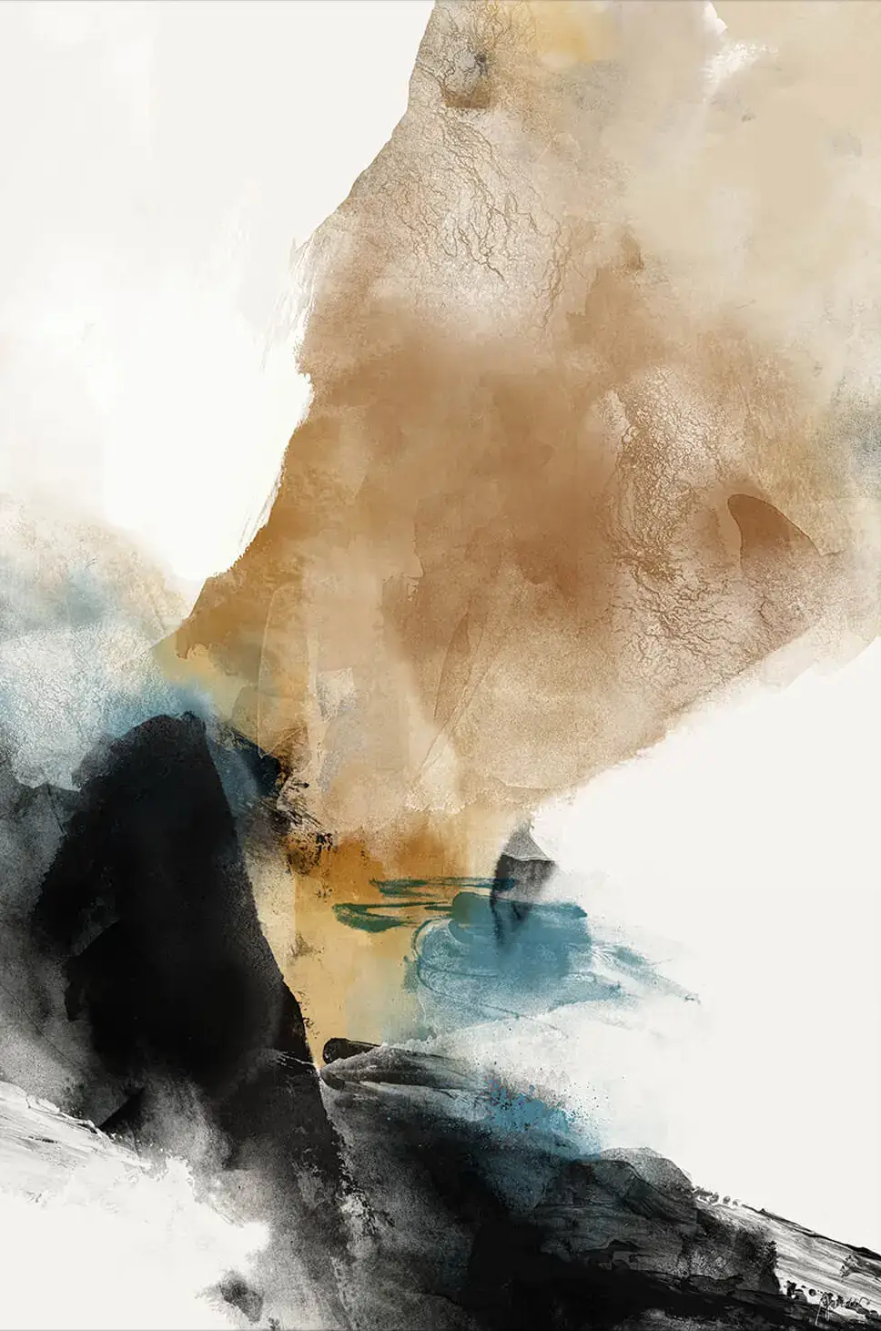 A second glance reveals micro-cracks inside the mocha mass, as if the surface has weathered gently over time. The teal wash sits almost below the ivory, creating a subtle depth that rewards closer viewing. Saturnine blacks transition to smoke gray toward the base, preventing the dark area from feeling flat. Slim white streaks run diagonally across the corner, guiding the eye upward and keeping the vertical art lively. With its muted palette and generous negative space, the piece remains calm while still engaging the viewer.