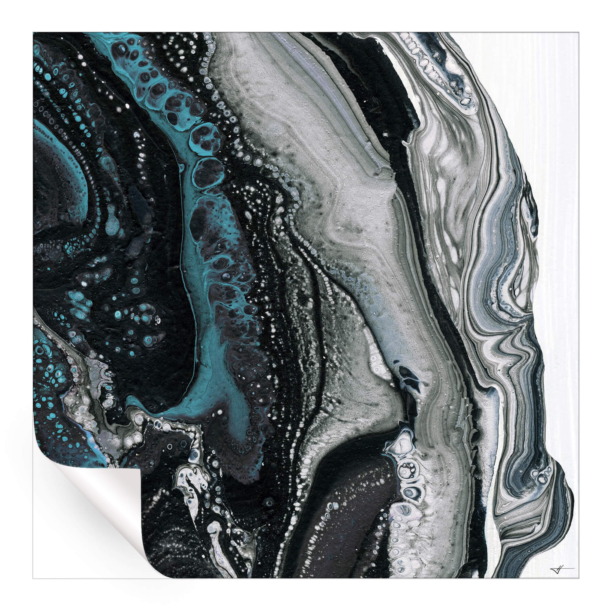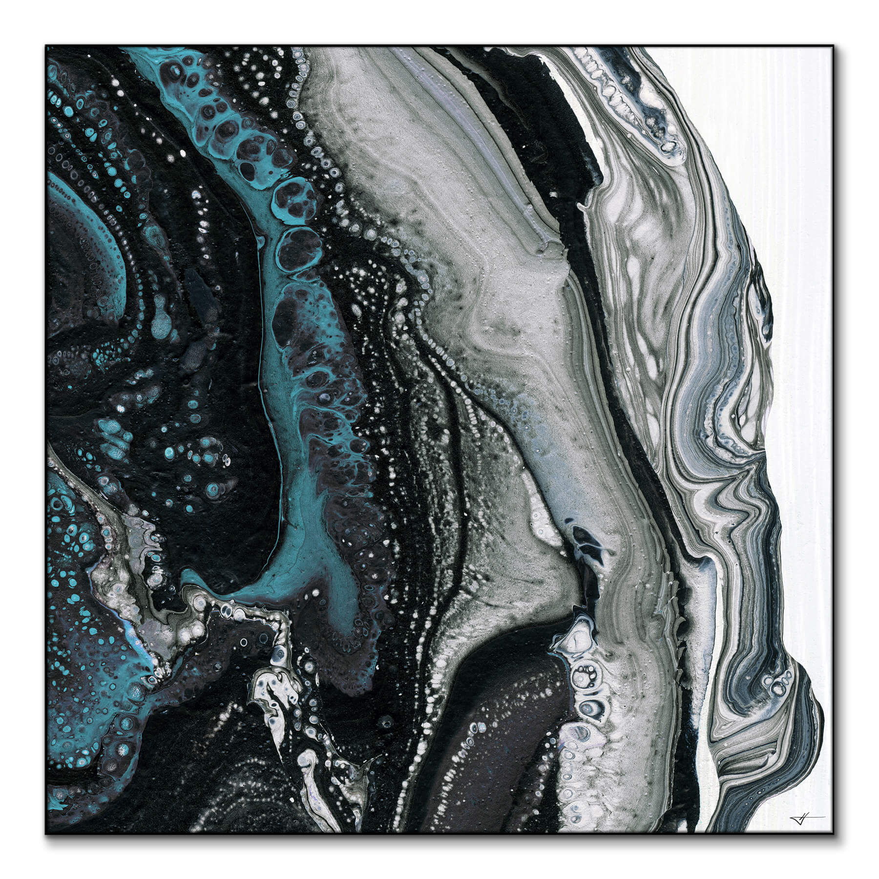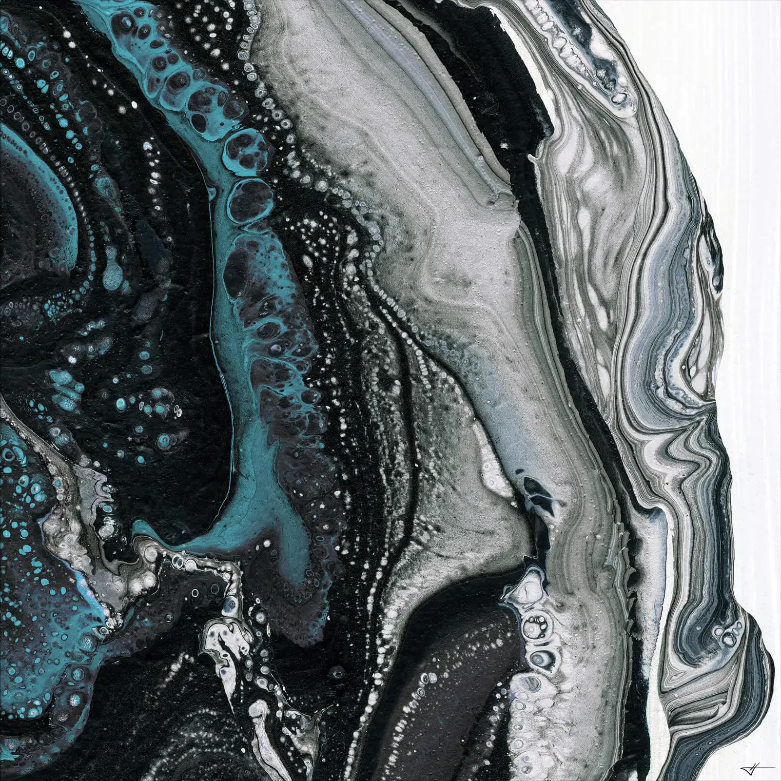 Swirling patterns that resemble marble with accents of teal create depth in this abstract liquid painting.