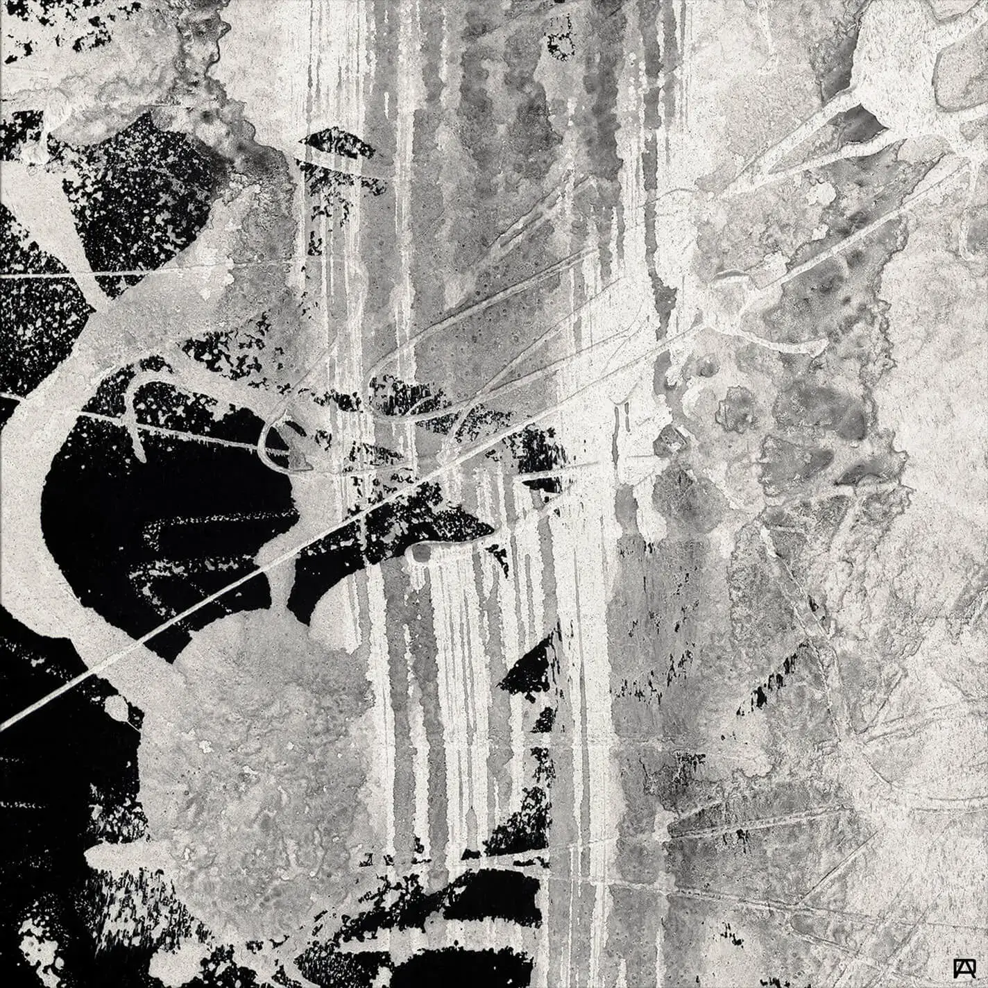 Organic shapes, with various textures, come together to form this abstract black and white painting.