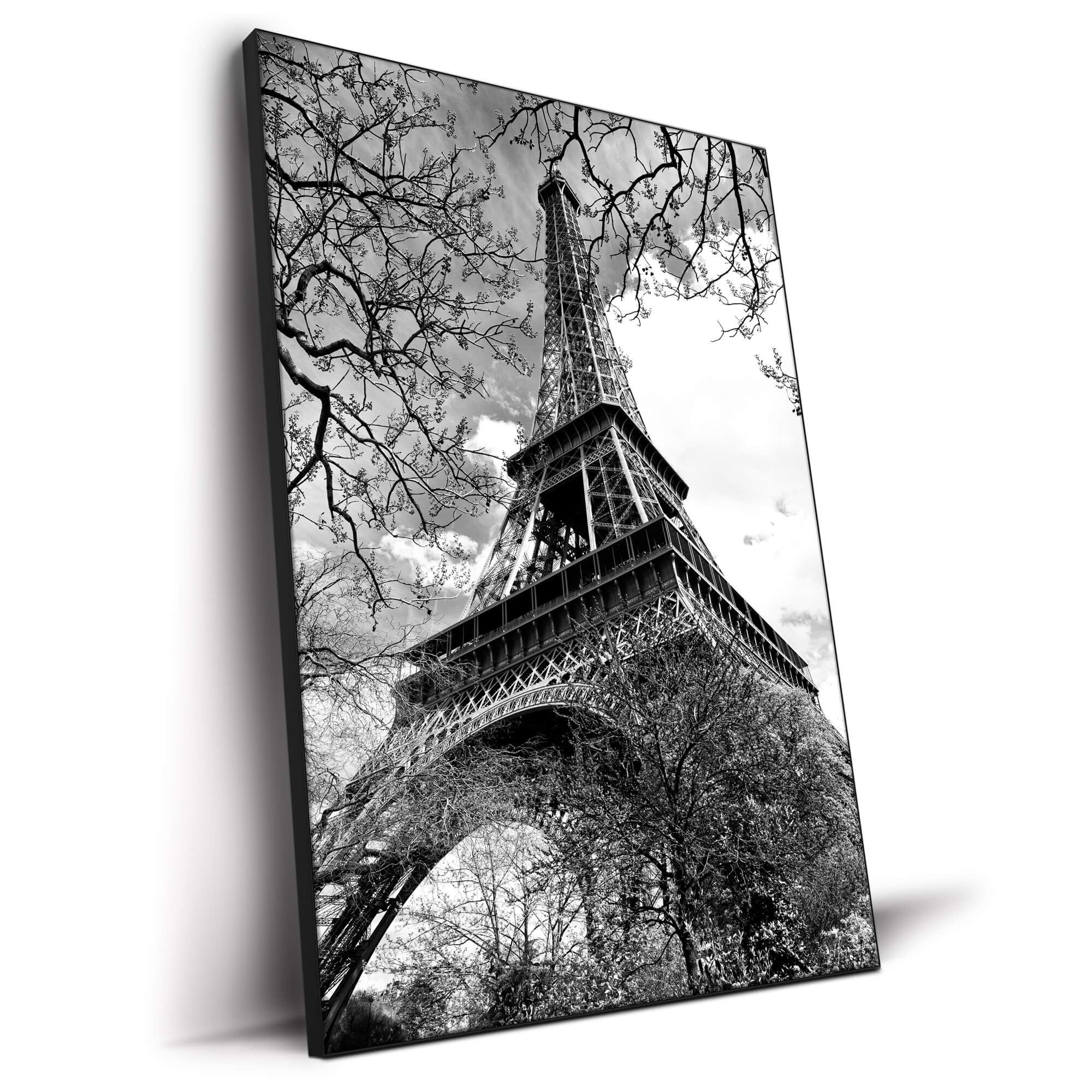 The tower rises majestically, its lattice structure a marvel of engineering and design, while the branches in the foreground add a delicate, almost lace-like texture to the composition. The image conveys a sense of the tower’s scale and the ethereal beauty of Paris’s iconic landmark, inviting viewers to consider the blend of nature and human craftsmanship.