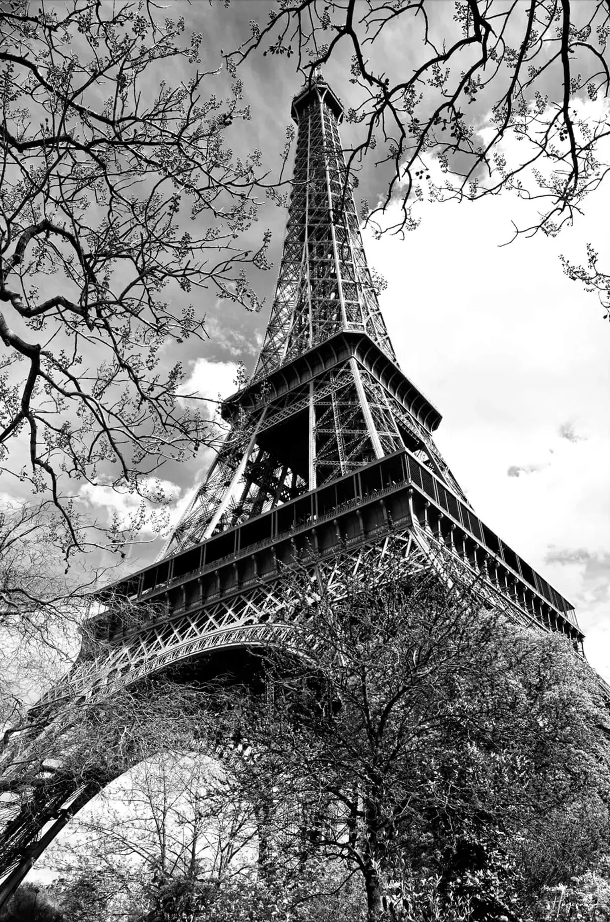 The Eiffel Tower is captured from a unique perspective, framed by the bare branches of trees. The contrast between the organic lines of the branches and the geometric ironwork of the tower creates a compelling visual juxtaposition.