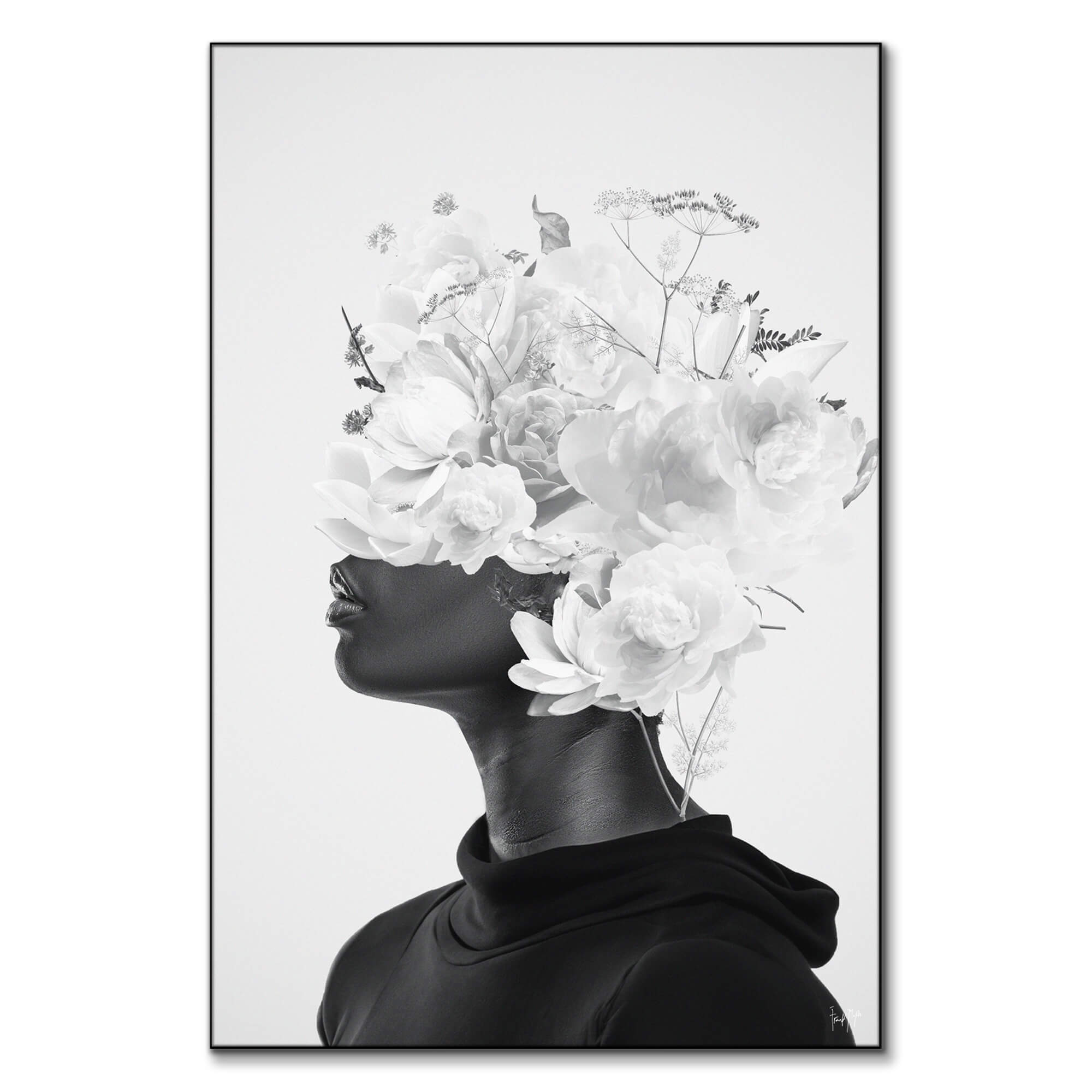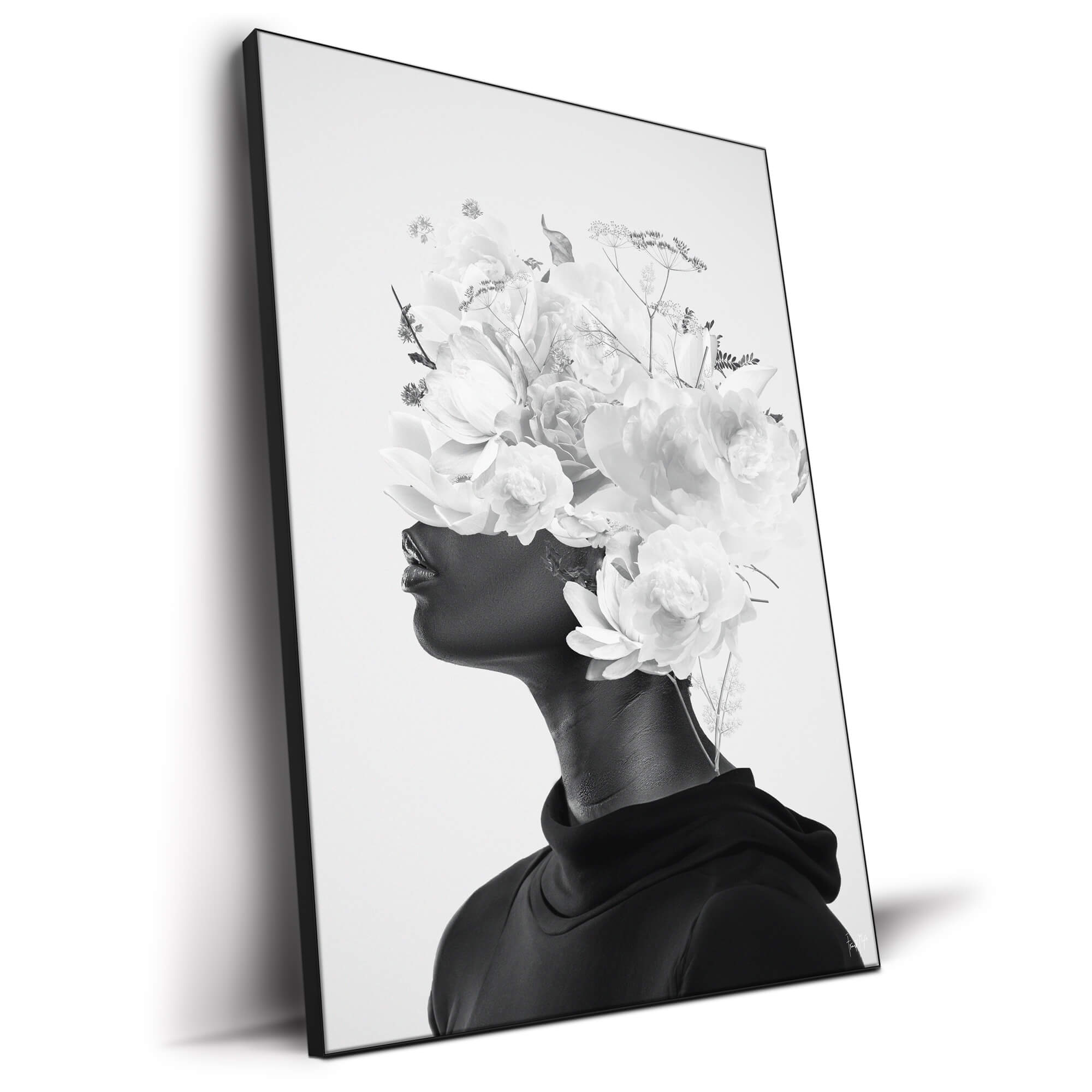 This monochrome floral portrait radiates elegance through simplicity. A soft cascade of white blooms emerges from the subject’s silhouette, creating a serene balance between contrast and calm. The interplay of light and shadow emphasizes form and texture, turning the minimal color palette into something deeply expressive.