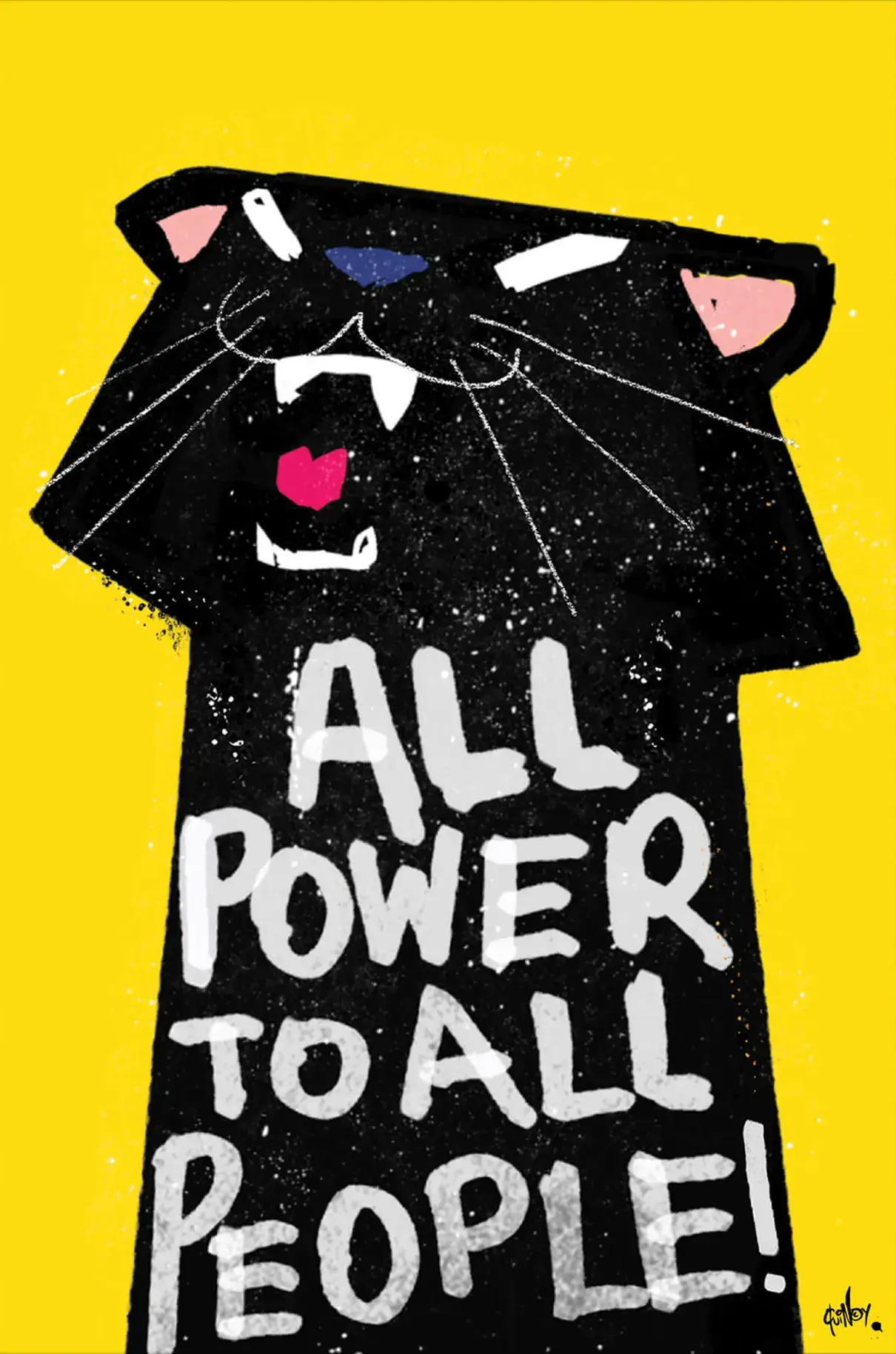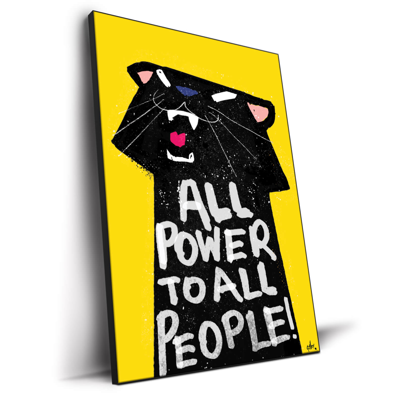 A stylized black panther with a bold expression, set against a bright yellow background. The panther’s torso is comprised of text that reads “ALL POWER TO ALL PEOPLE!” in white, blocky letters. The design is rough and textured, giving it a hand-painted look. The artwork has a strong, impactful message, conveyed through a combination of visual symbolism and text.
