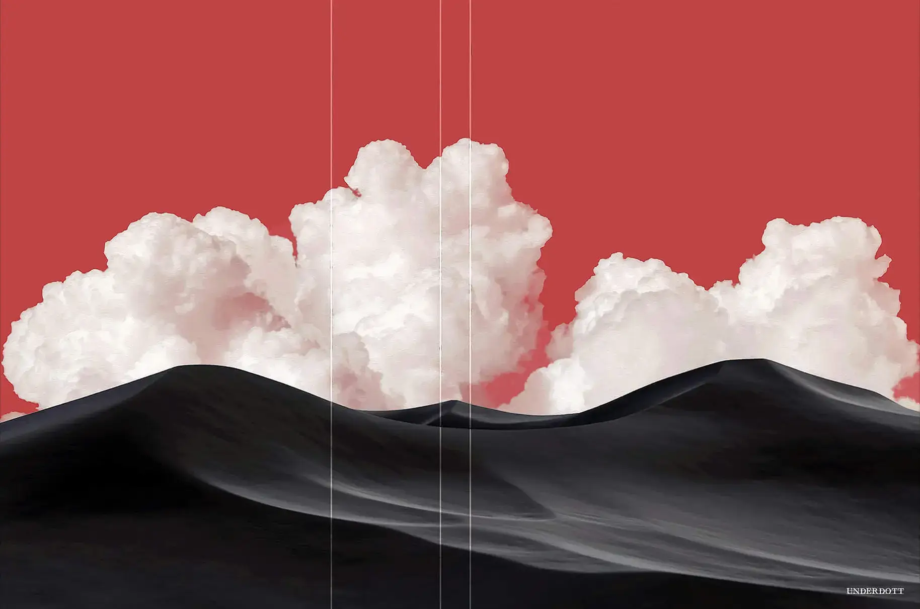 Rolling dunes rise in velvety black, their ridgelines catching faint silver streaks like moonlit sand. Each curve folds into the next, forming a calm yet powerful horizon. Behind the desert silhouette, billowing white clouds float low and dense, sculpted like fresh meringue. They hover against a flat crimson backdrop that feels both dawn and dusk at once.
