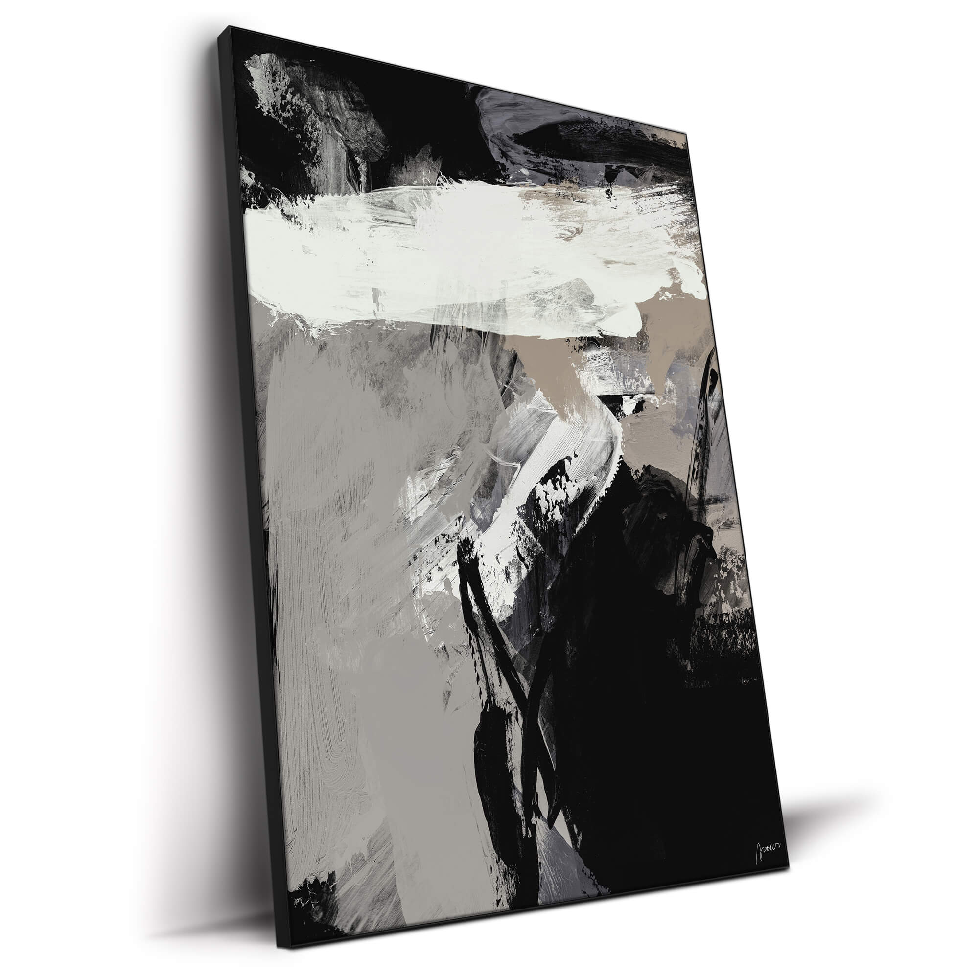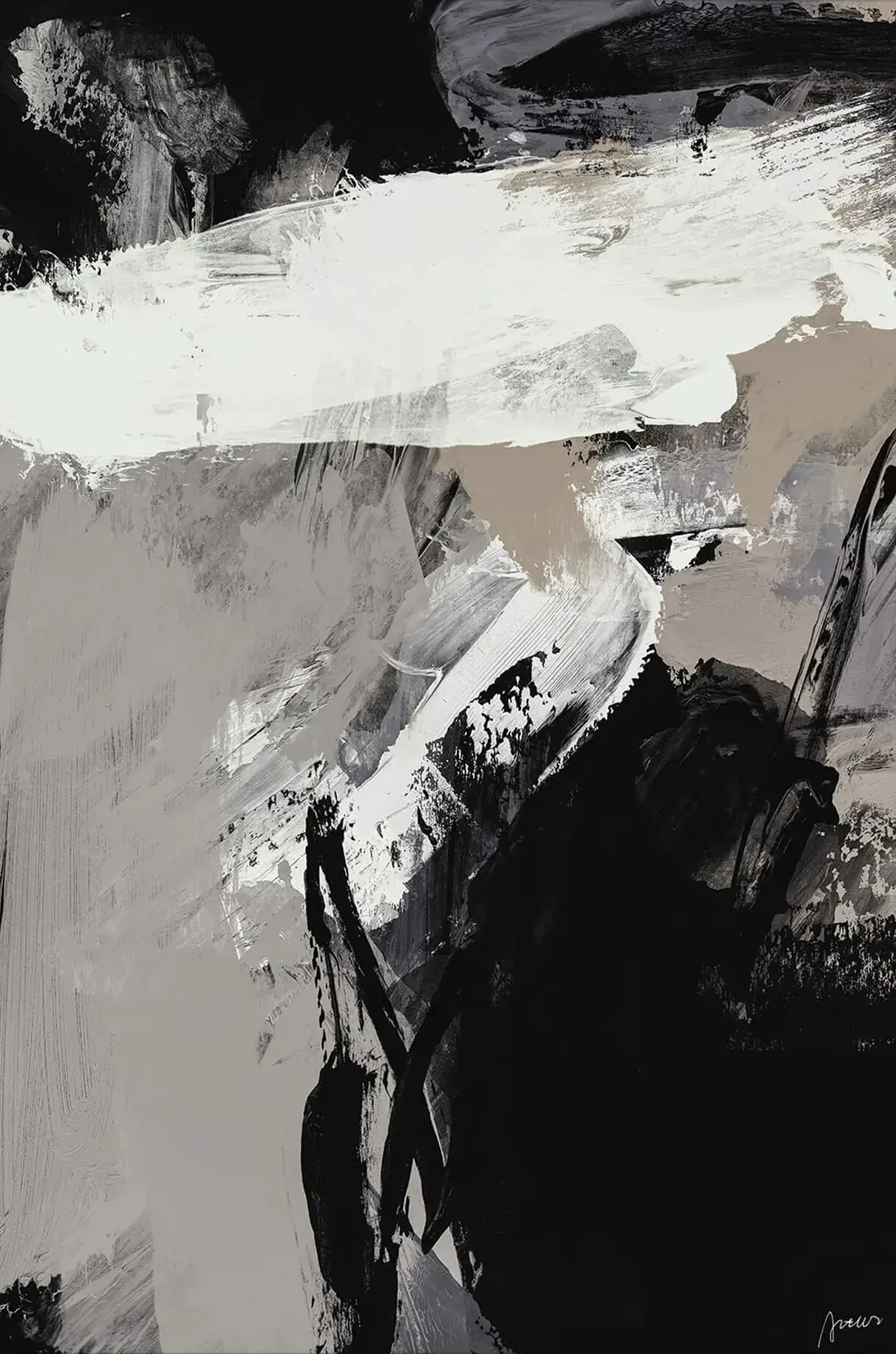 Bold strokes of black and white dominate, intersected by nuanced shades of gray. Contrast appears as if captured in a moment of stormy skies breaking just before the calm. Textural layers imply movement, an energetic exchange between light and darkness, resembling an abstract tempest of nature’s fury and grace.