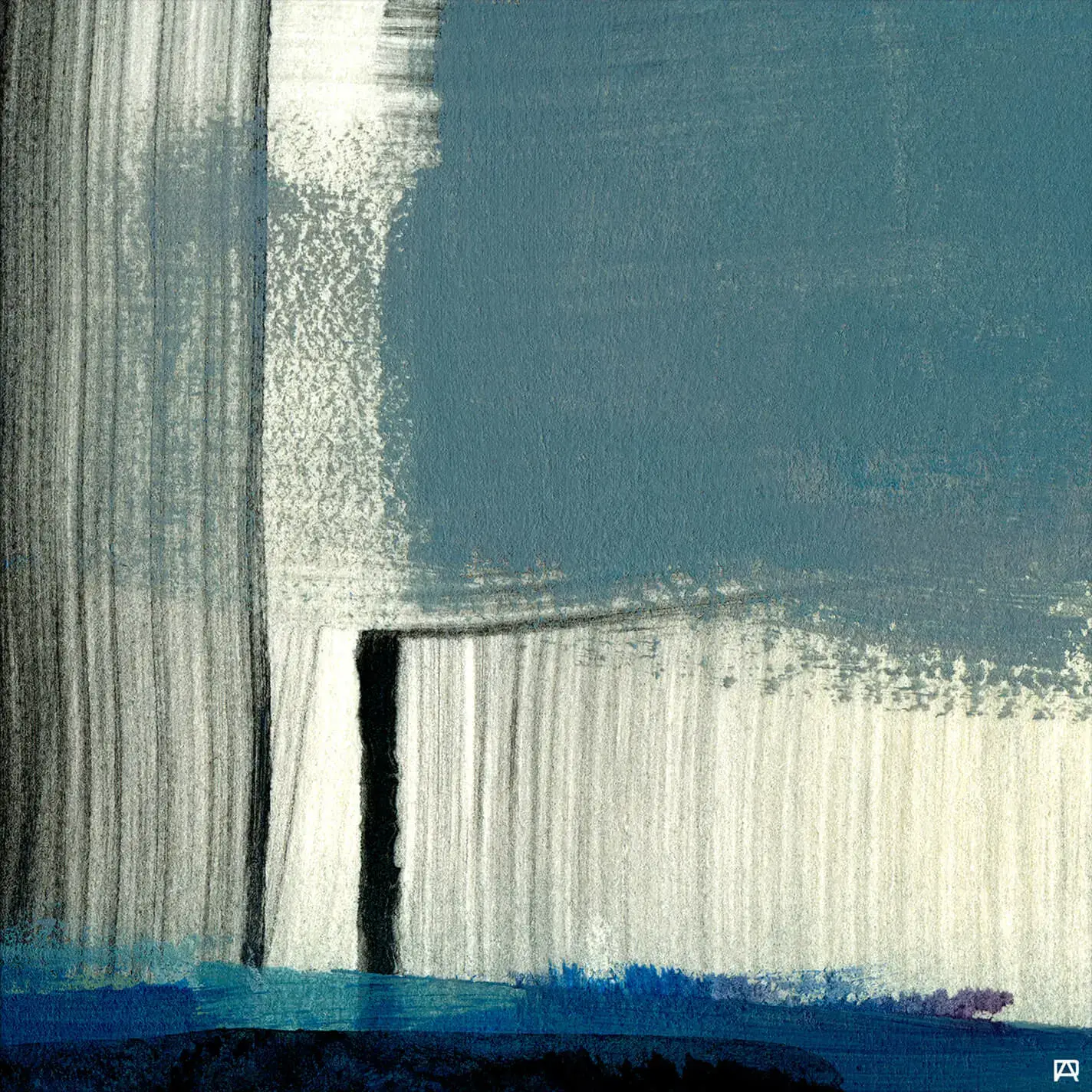A textural cascade of white creates movement against a backdrop of muted blues is presented in this blue abstract art.
