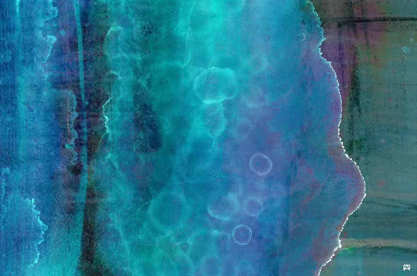 An underwater-like atmosphere is created with a bleed of deep blues and vibrant teals in this blue and green abstract art.