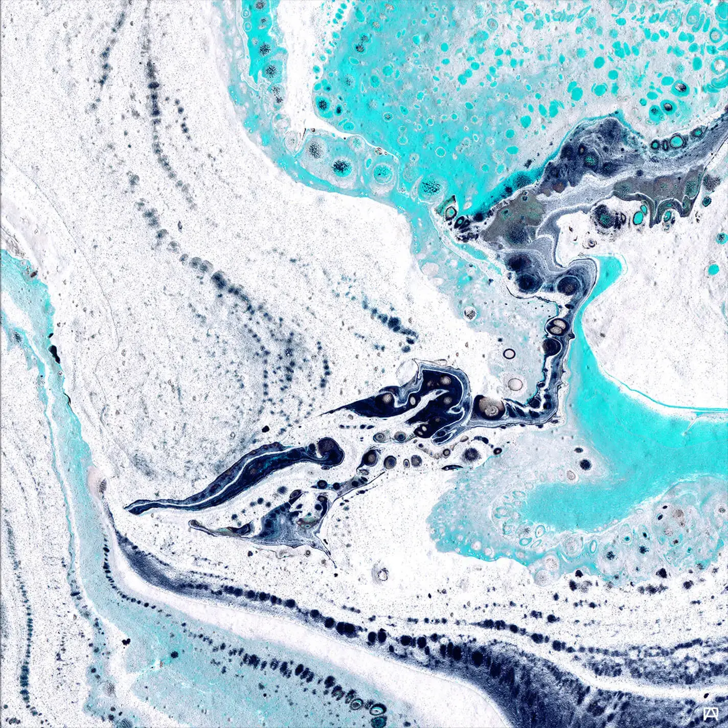 Small bubbles add organic texture to the composition, while the flow of the contrasting colors suggests movement.