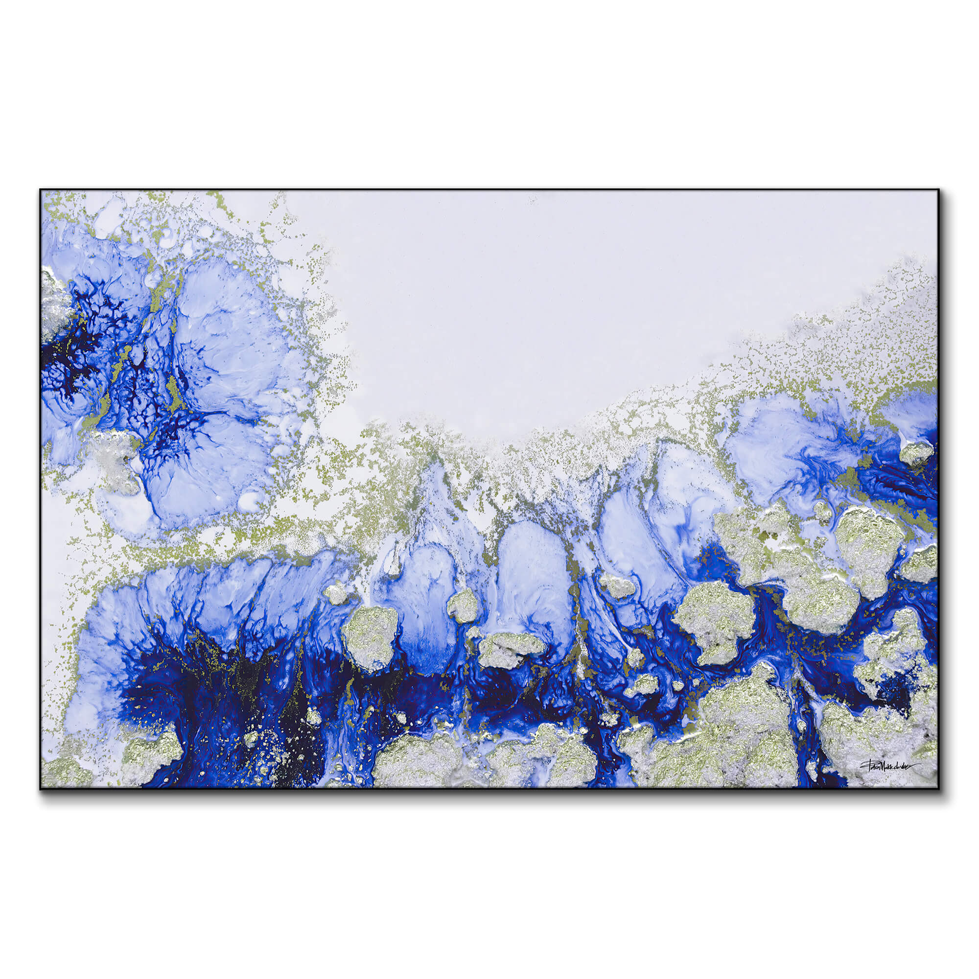 The deep oceanic blues in this abstract piece convey a sense of depth and mystery, while the white and silver highlights add brightness and contrast. The texture of the paint suggests the natural movement of water, with waves crashing into smooth shores, creating an almost ethereal quality. The piece evokes a tranquil yet powerful sense of the ocean’s ebb and flow, capturing the essence of calm and force in one stunning composition.
