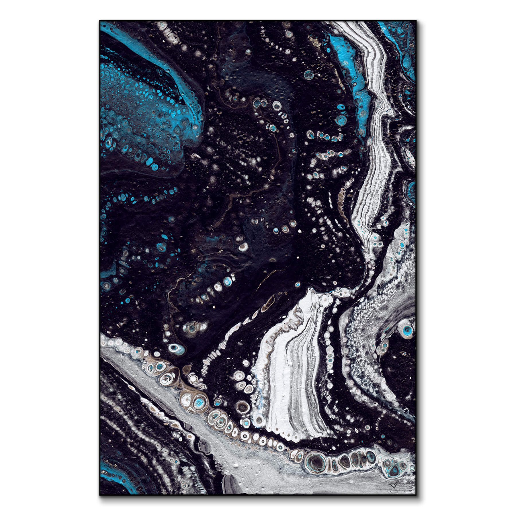 Visually organic shapes swirl together in shades of inky black, white and blue in this dynamic abstract liquid wall art.