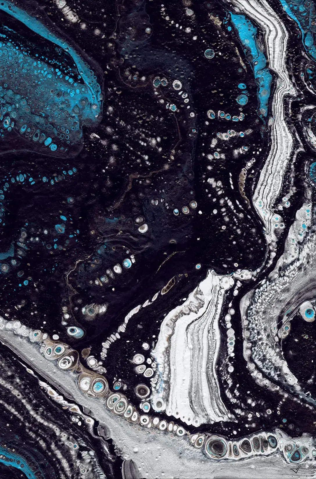 Pockets of bright blue and white break through the dark background, bringing to mind geological layering found in nature.