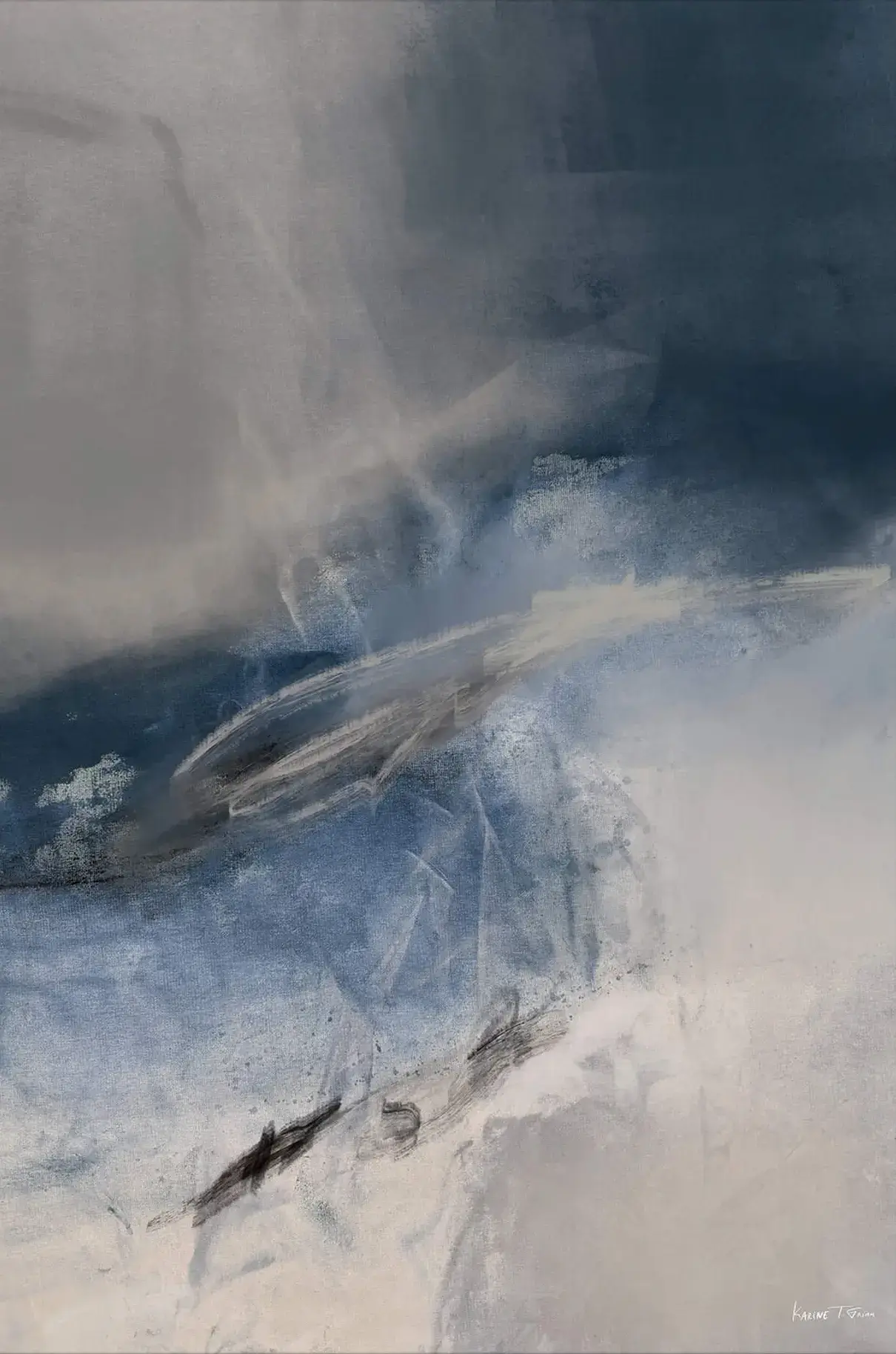 Soft, sweeping strokes in a soothing blend of blue and grays create movement, reminiscent of a foggy seascape. The gentle gradation of colors and textures evokes a misty and ethereal atmosphere, with subtle highlights and shadows that add a sense of depth.