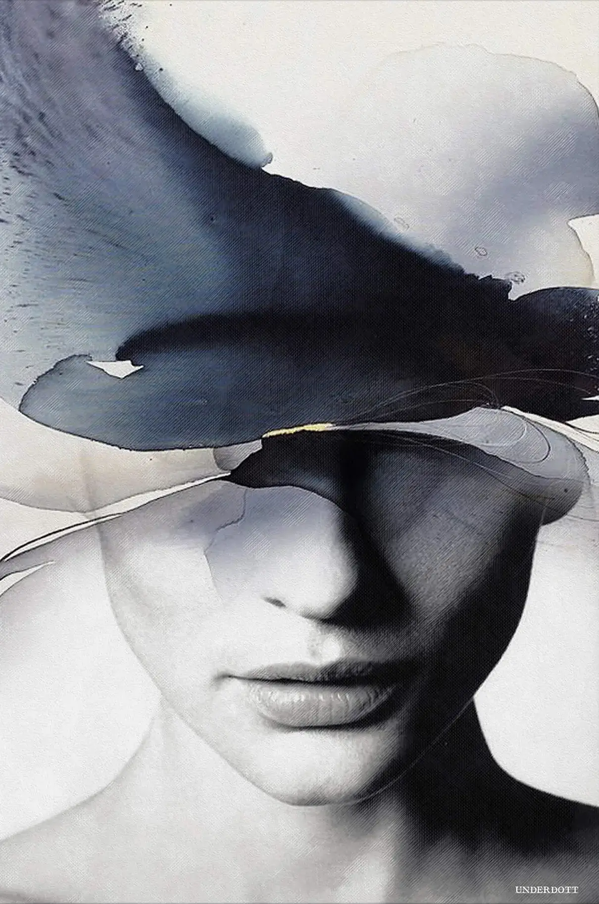 Loose pools of midnight and slate blue float above a softly lit face, forming a misty hat that blurs reality. The lips and nose remain sharp while eyes disappear beneath airy ink, inviting quiet contemplation. Fine gradients of gray melt into pale ivory, then deepen into velvet shadows near the neckline.