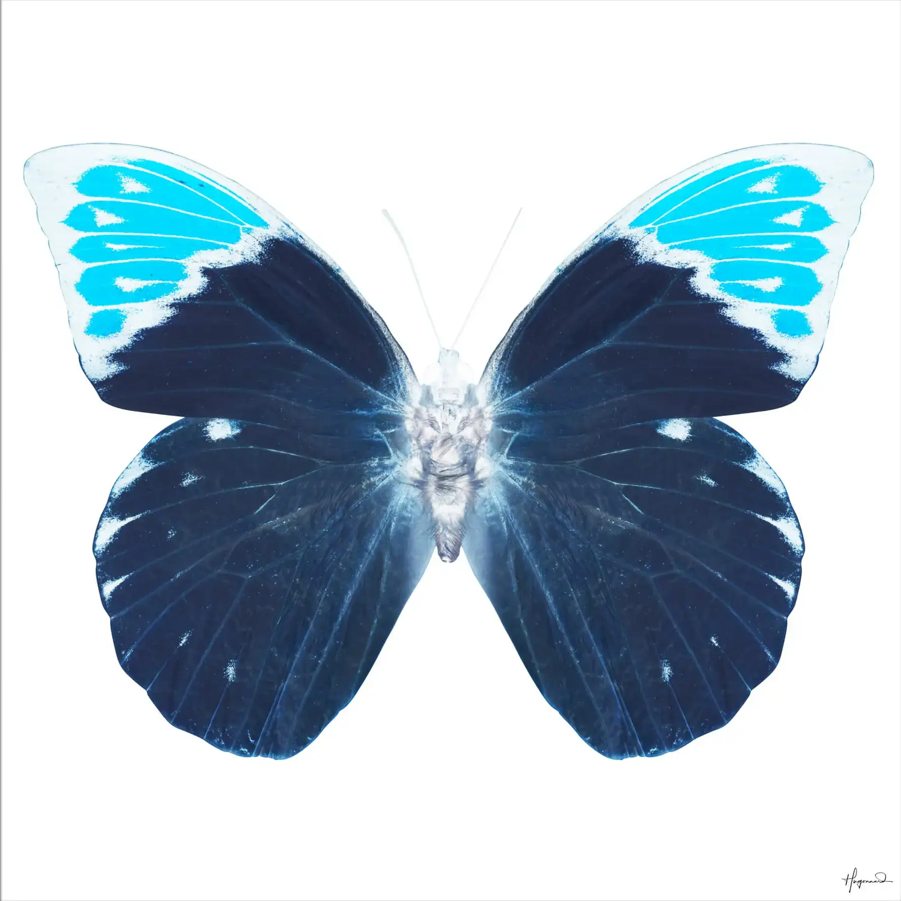 This artwork presents a visually arresting image of a Hebomoia butterfly with an inverted color scheme, where the deep blues and light accents create a captivating contrast.
