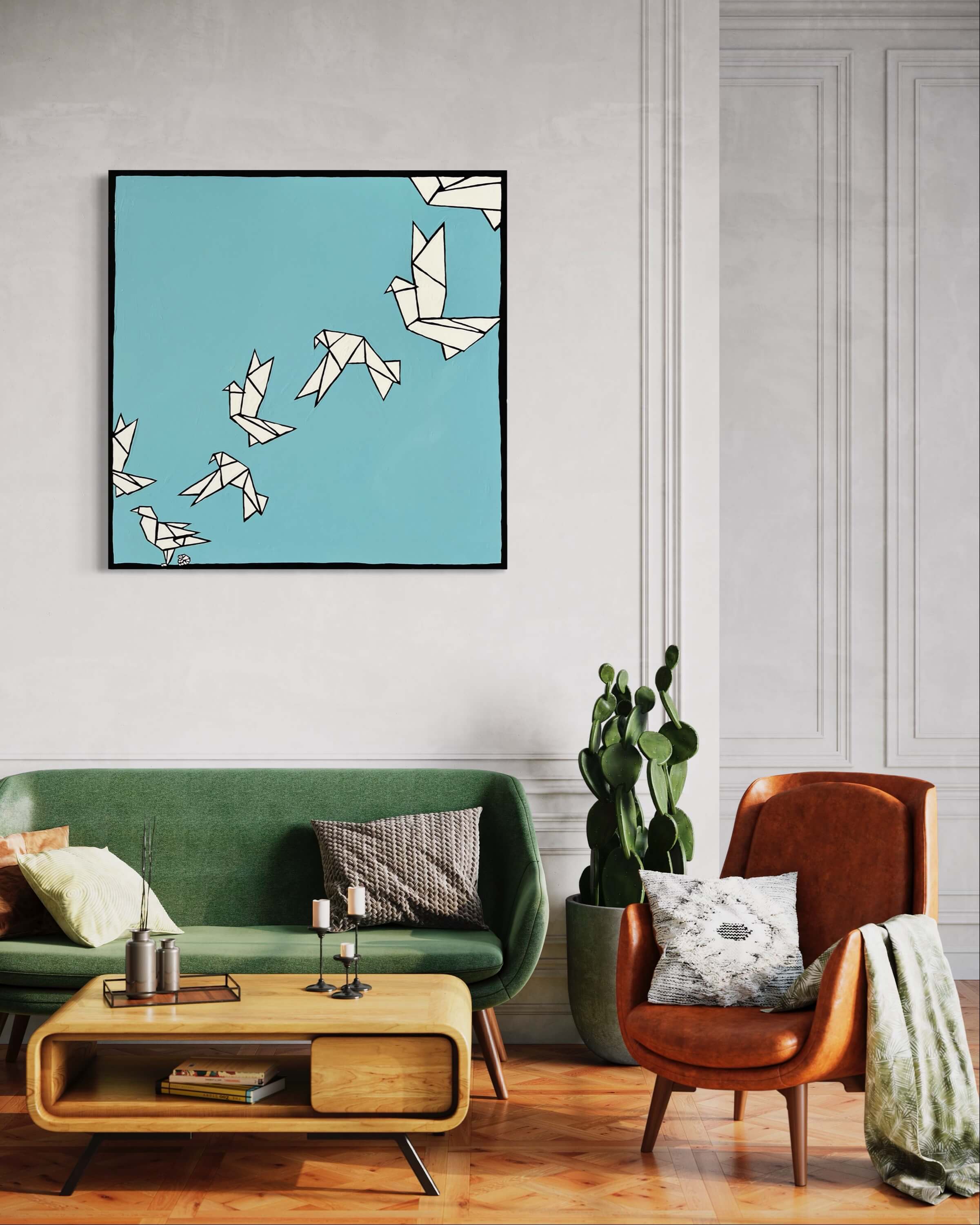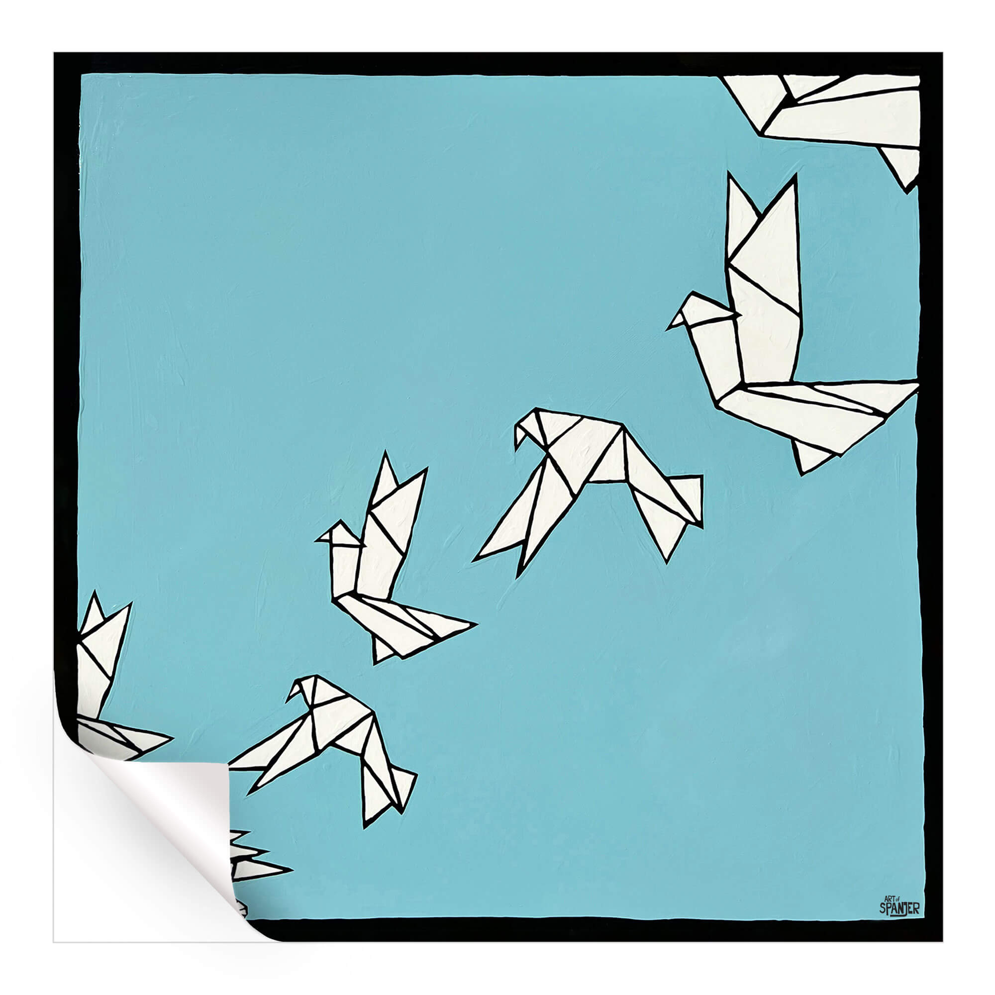 Composed of geometric shapes, the minimalistic style of the birds is composed of geometric shapes, sharp angles, and clean lines that resemble folded paper, all framed by a thick, black border.