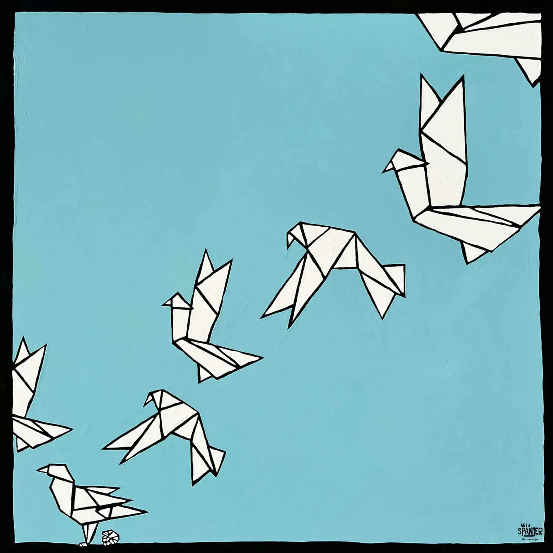 A series of white origami birds fly against a solid, pale blue background. Positioned at different angles, the path of the birds suggest movement across the canvas.