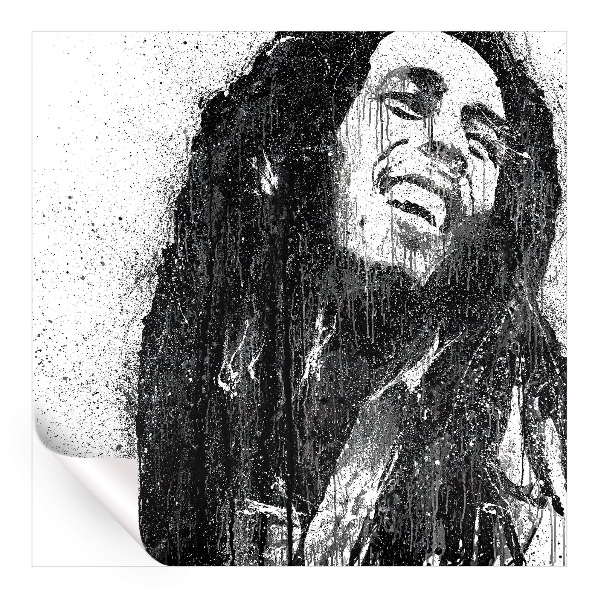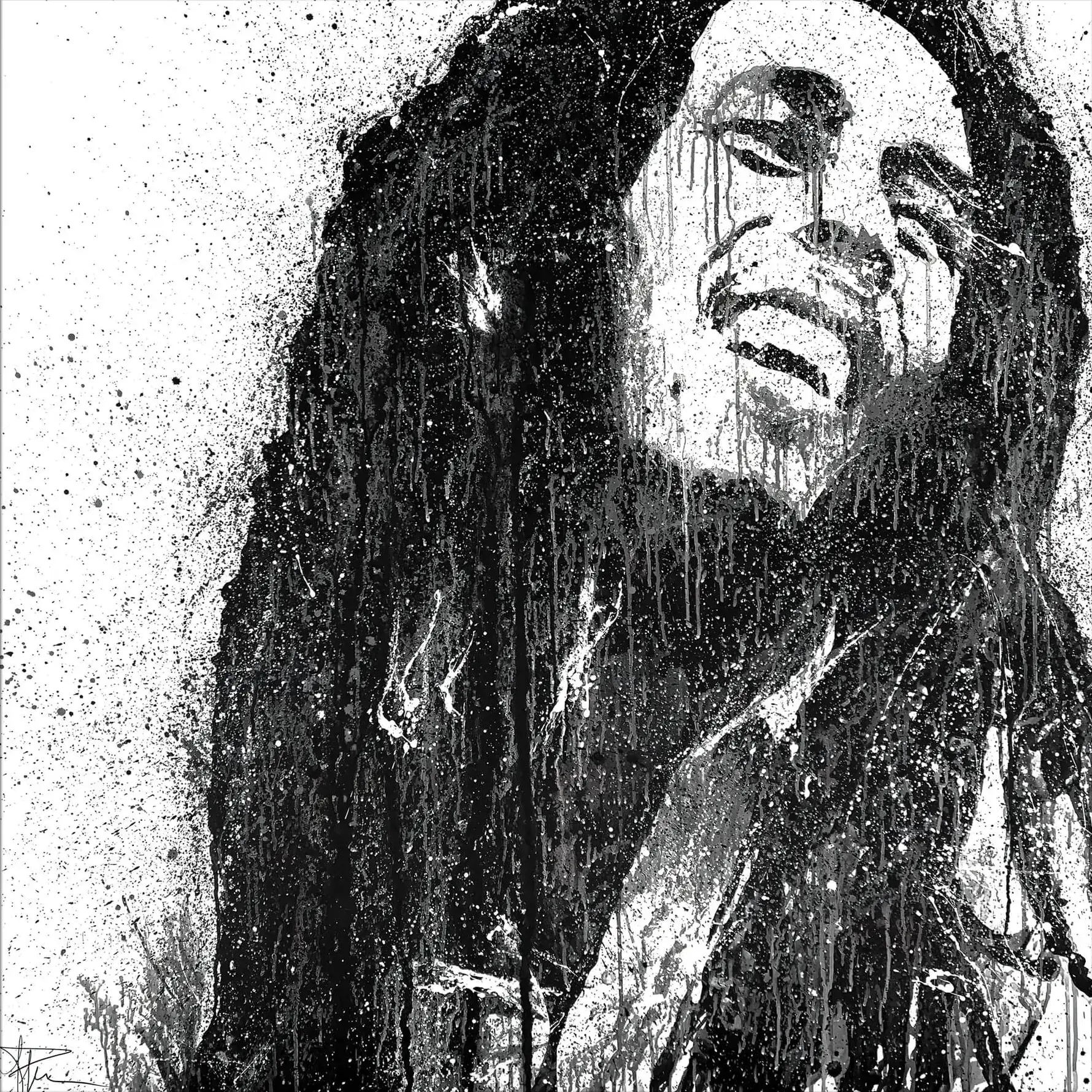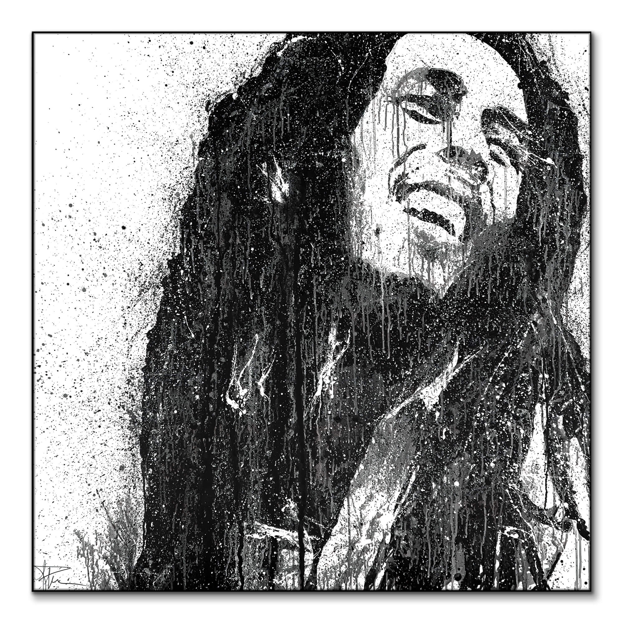 This striking black and white portrait captures the serene yet powerful essence of Bob Marley, with his iconic dreadlocks and expressive gaze. The use of stark contrasts and the spattered, dripping paint technique add a raw, emotional depth to the image, reflecting the passion and soul of Marley’s music.