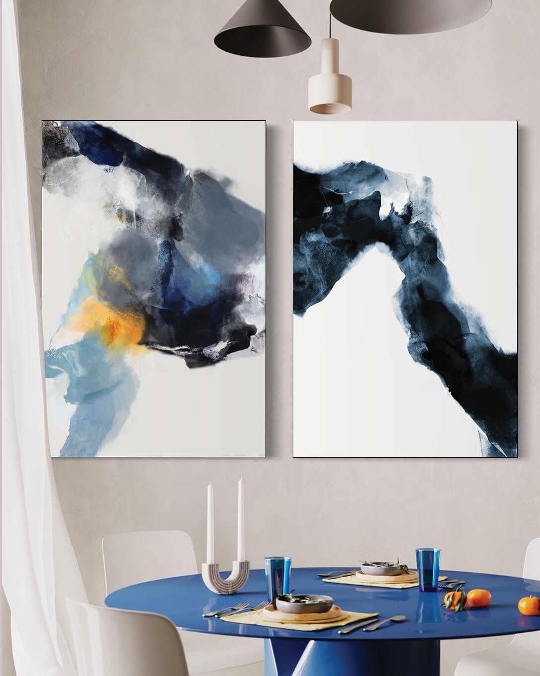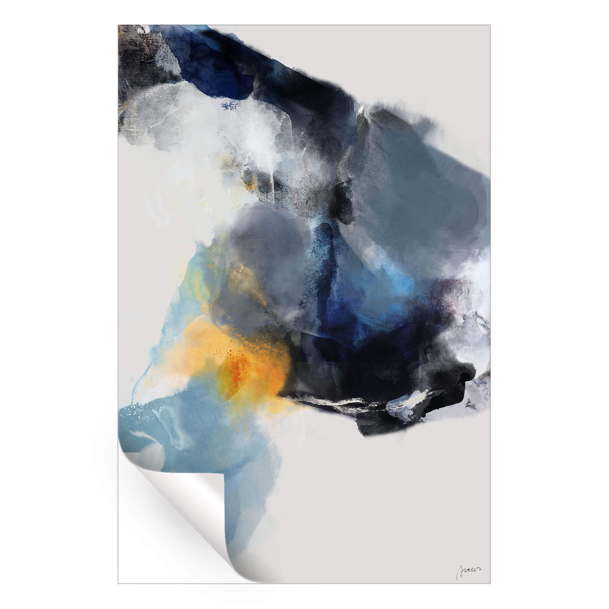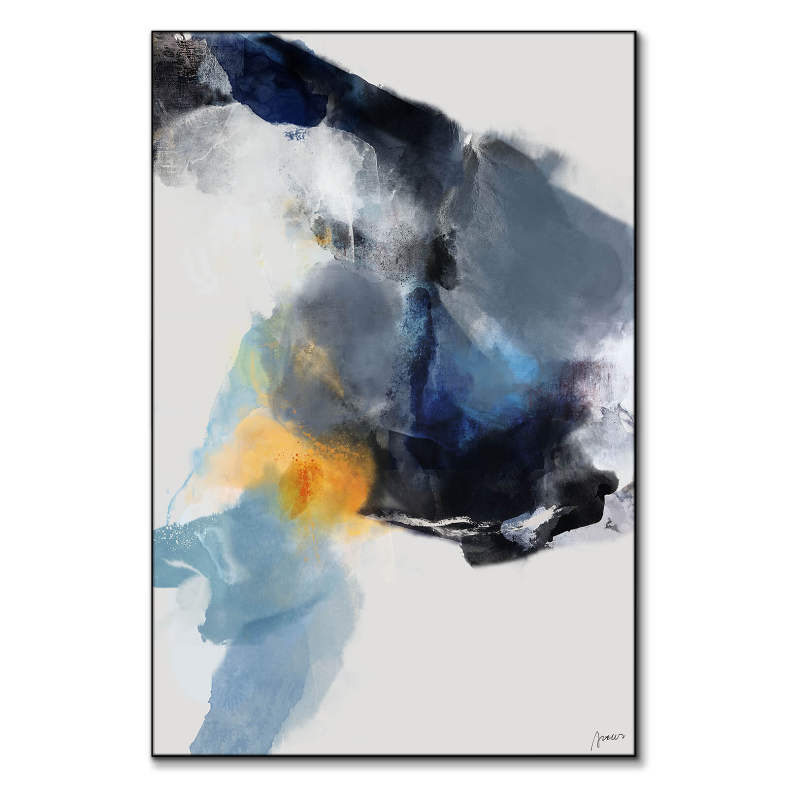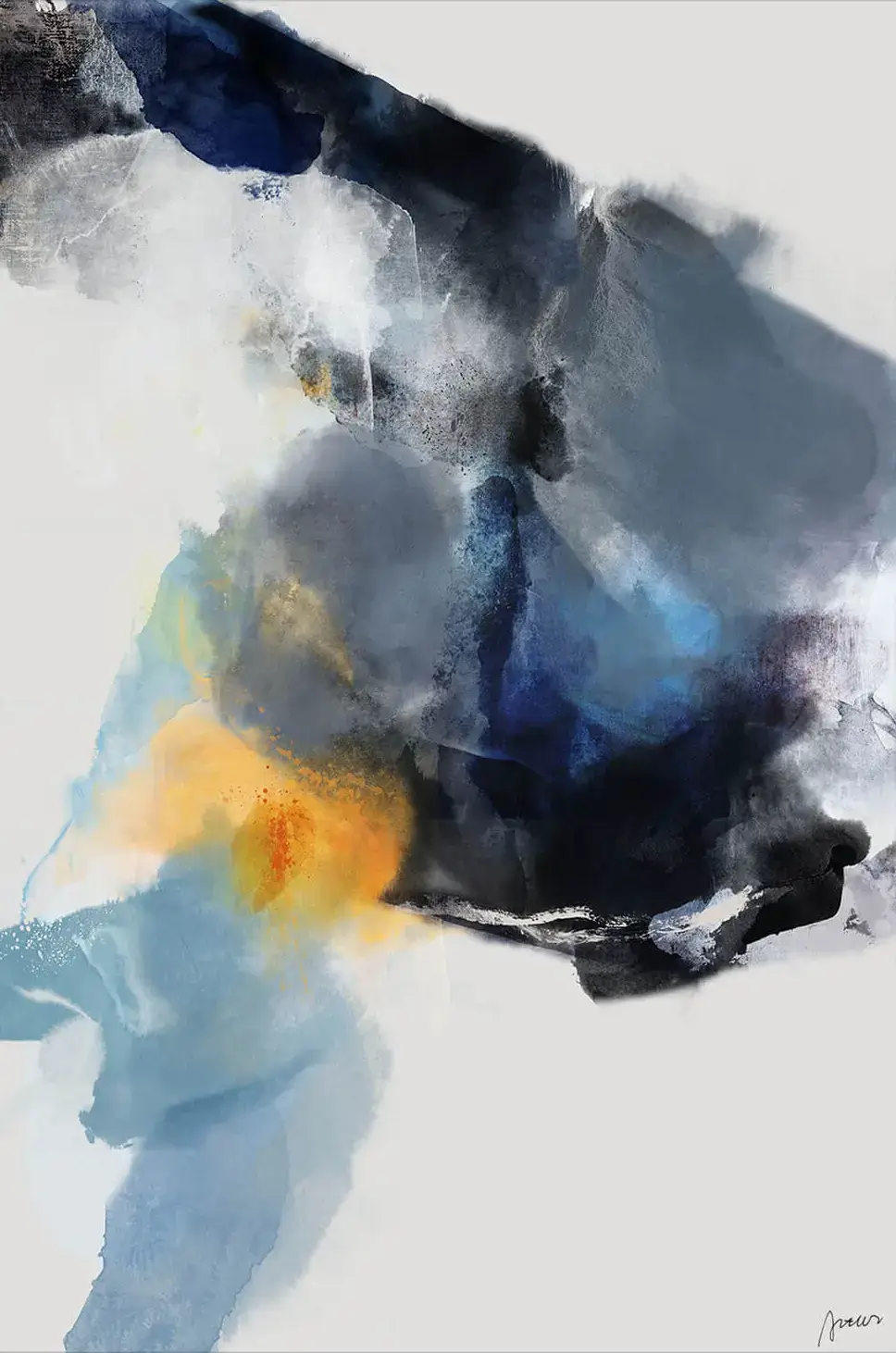 Swathes of deep blue and soft azure blend with smudges of bold charcoal and grey, creating a brooding atmosphere punctuated by a solitary burst of warm yellow.
