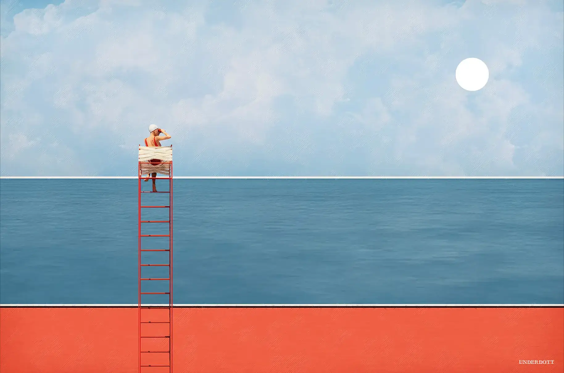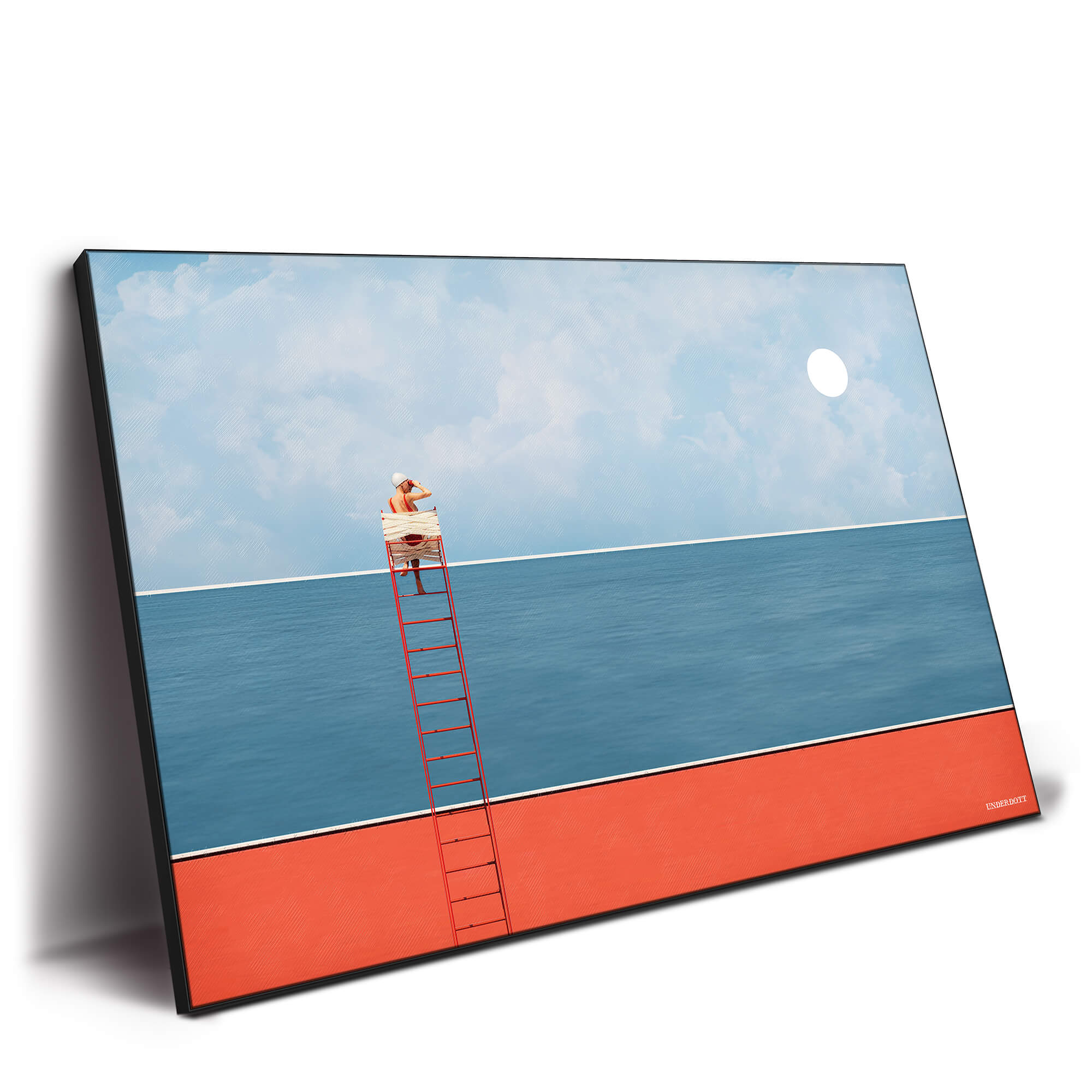 This surreal coastal scene captures balance, perspective, and a sense of quiet freedom. A lone figure sits perched on a red ladder that rises from a bright coral platform into a calm, endless blue sea. Wrapped in a towel, they look out over the horizon, framed by a soft sky and distant white sun. The minimal composition and clean geometry make it both soothing and thought-provoking.
