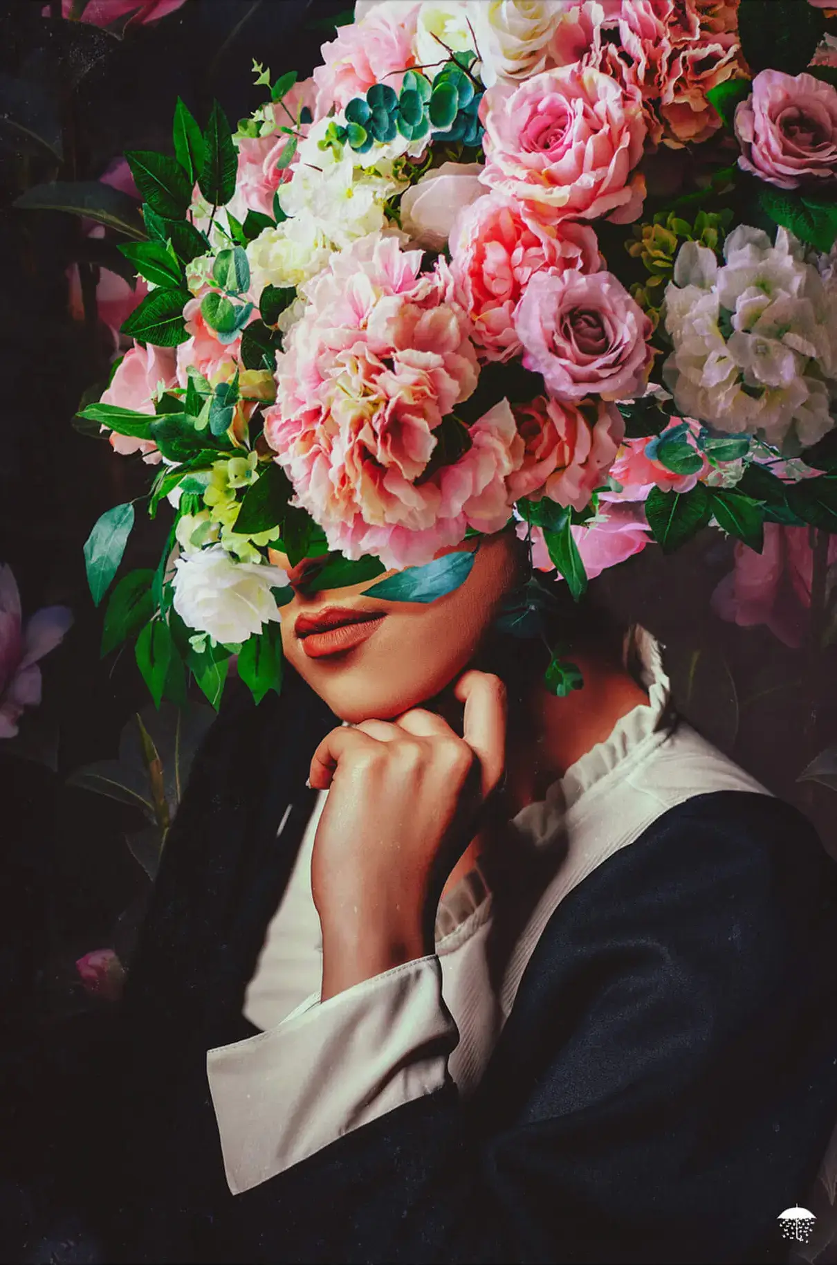 A figure is adorned with a lush bouquet of flowers, replacing their head. The blooms, in shades of pink and white, overflow with vitality. Leaves peek through the petals, adding a touch of verdant life.