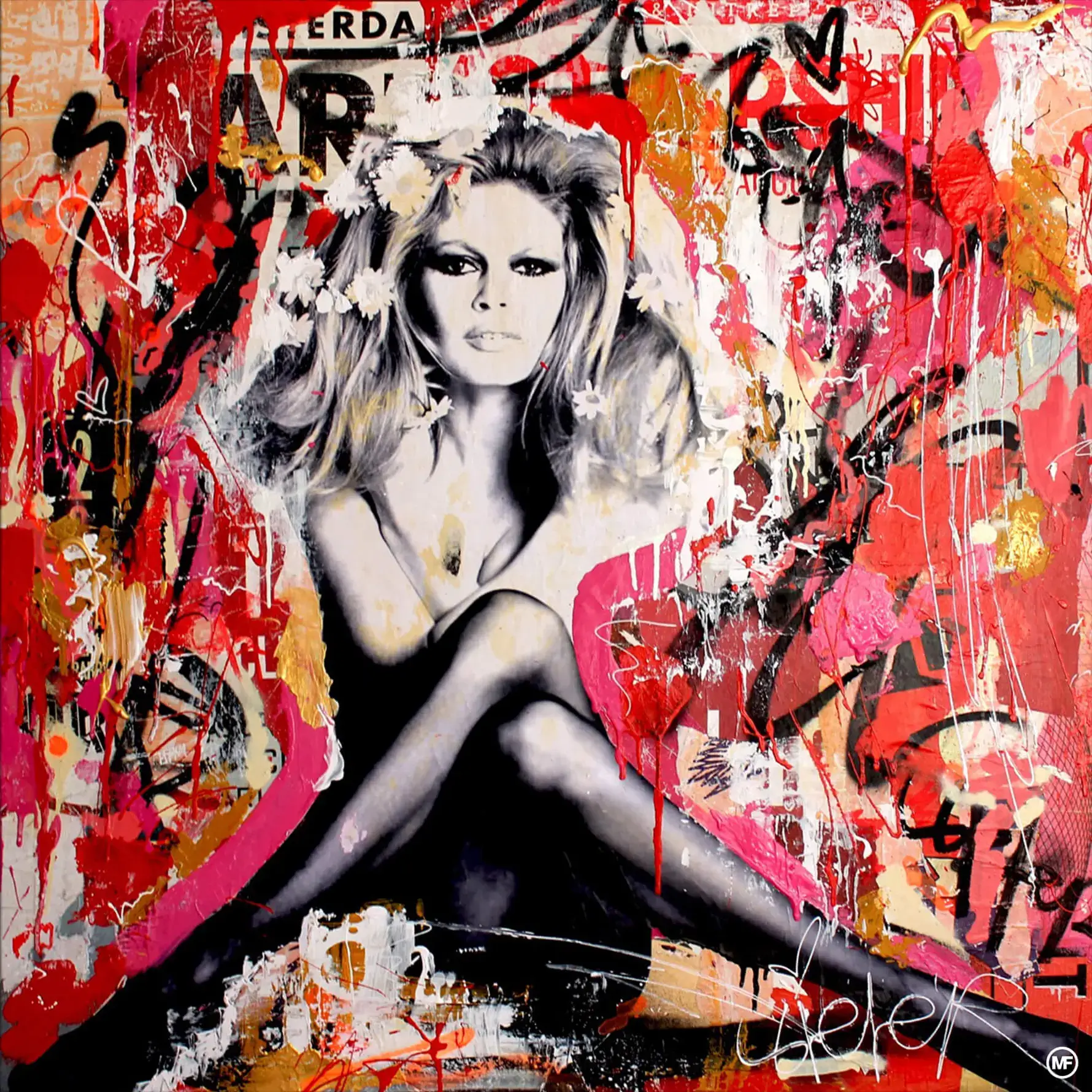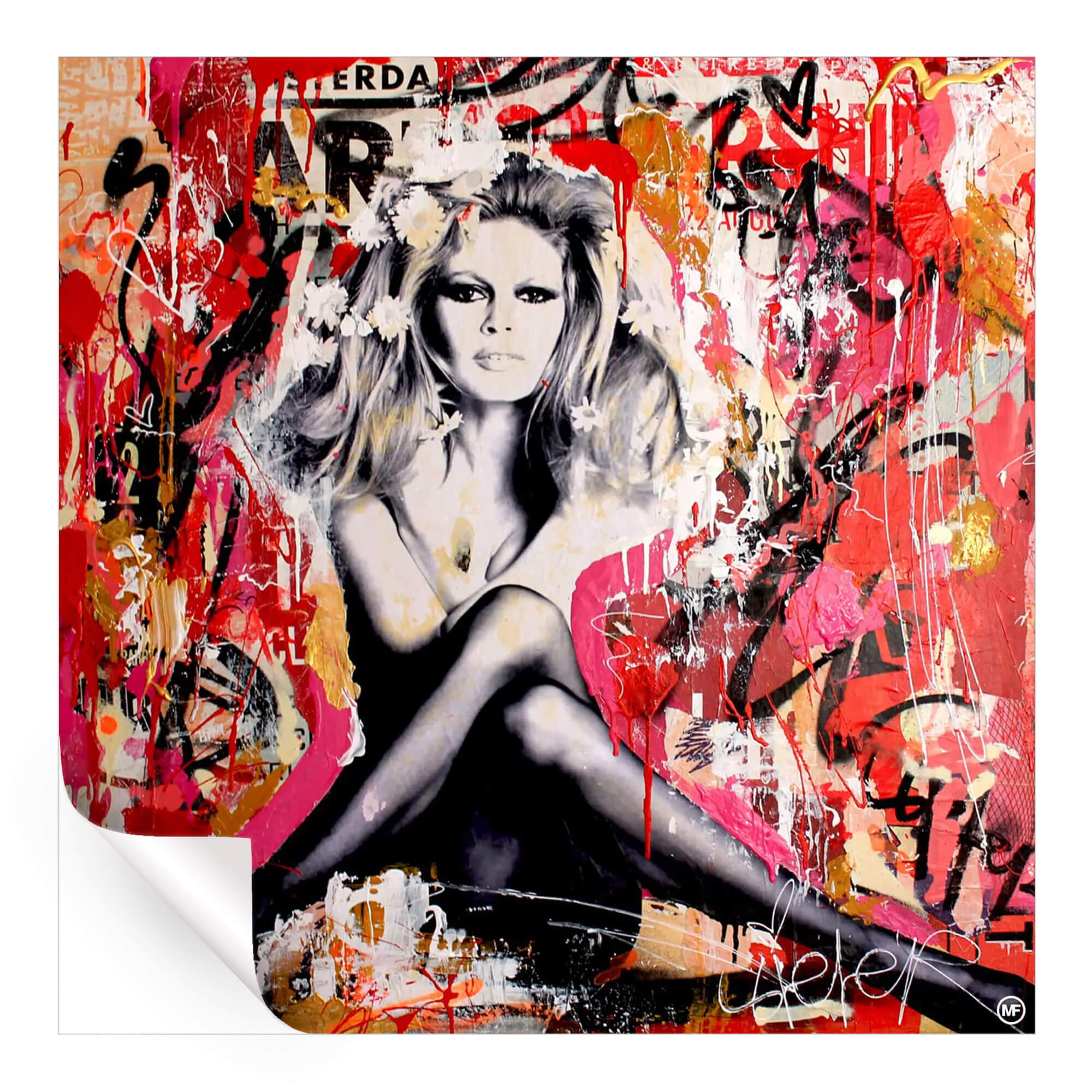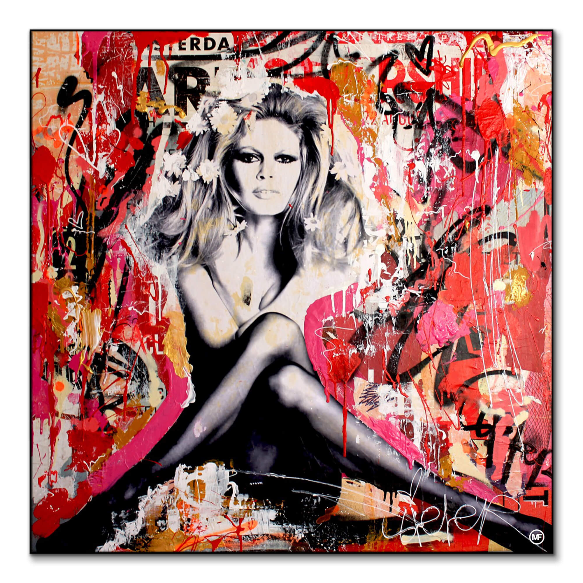 Inspired by the sun-soaked sophistication of St. Tropez, the artwork presents Bardot in her element, exuding the confidence and seductive charm that made her an icon of the ’60s. Splashed with bold, anarchic strokes of red and wild graffiti scrawls, it captures the rebellious spirit that Bardot personified, blending her classic beauty with the edgy vibrance of street art.