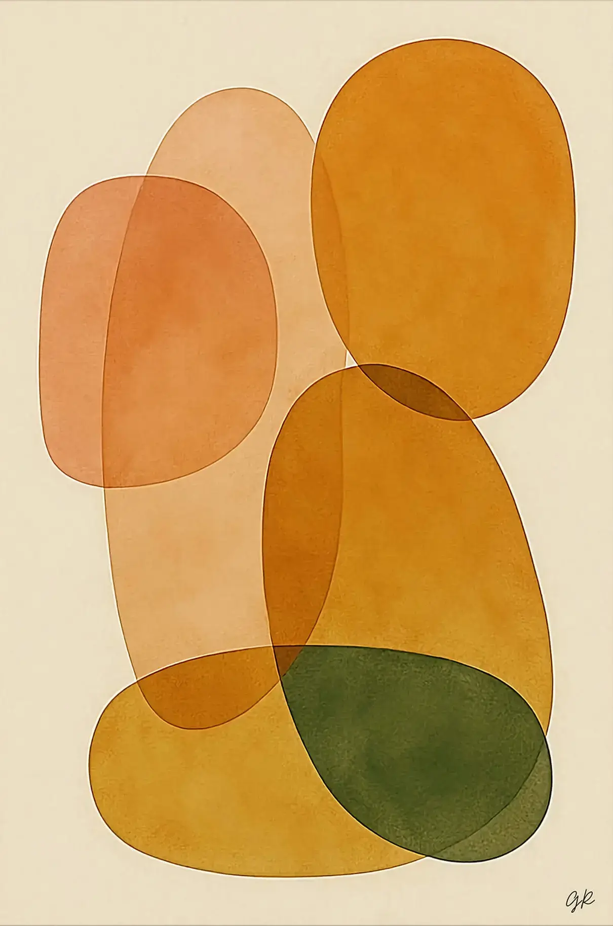 Soft shapes and warm hues blend in this minimal abstract composition. Layers of translucent amber, peach, and olive tones overlap to create balance and depth, forming a peaceful rhythm across the canvas. The gentle texture and organic lines give the piece a hand-touched feel that keeps it approachable and modern.