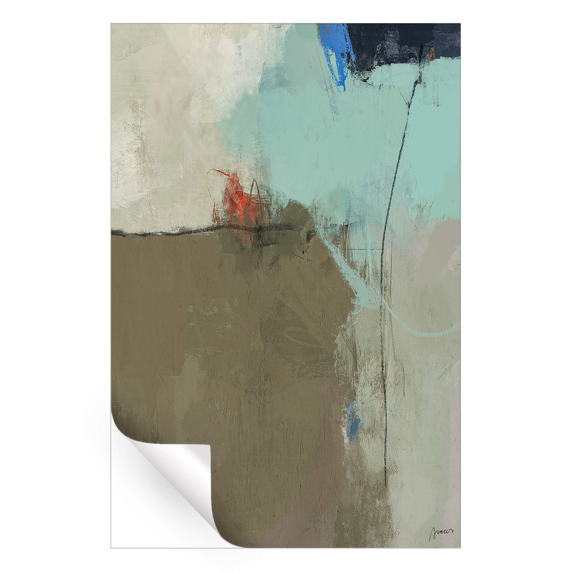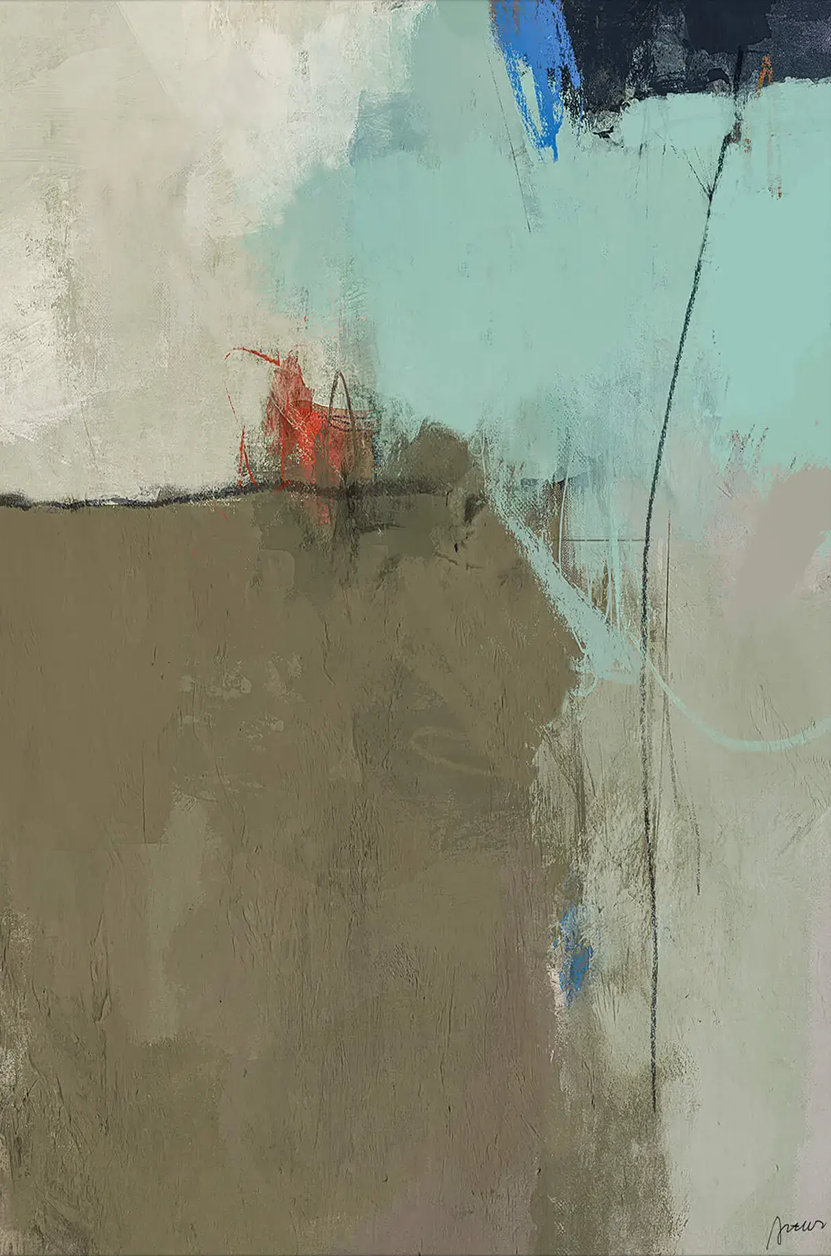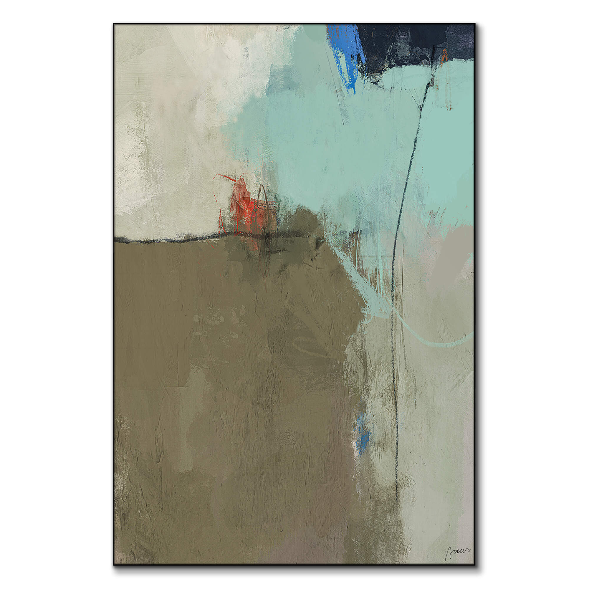 This composition blends earthy tones and bold contrasts into a study of texture and shape. Muted browns and olive greens meet soft turquoise, while a touch of crimson adds warmth and focus. The layering of brushwork creates tactile depth, giving it both balance and spontaneity.