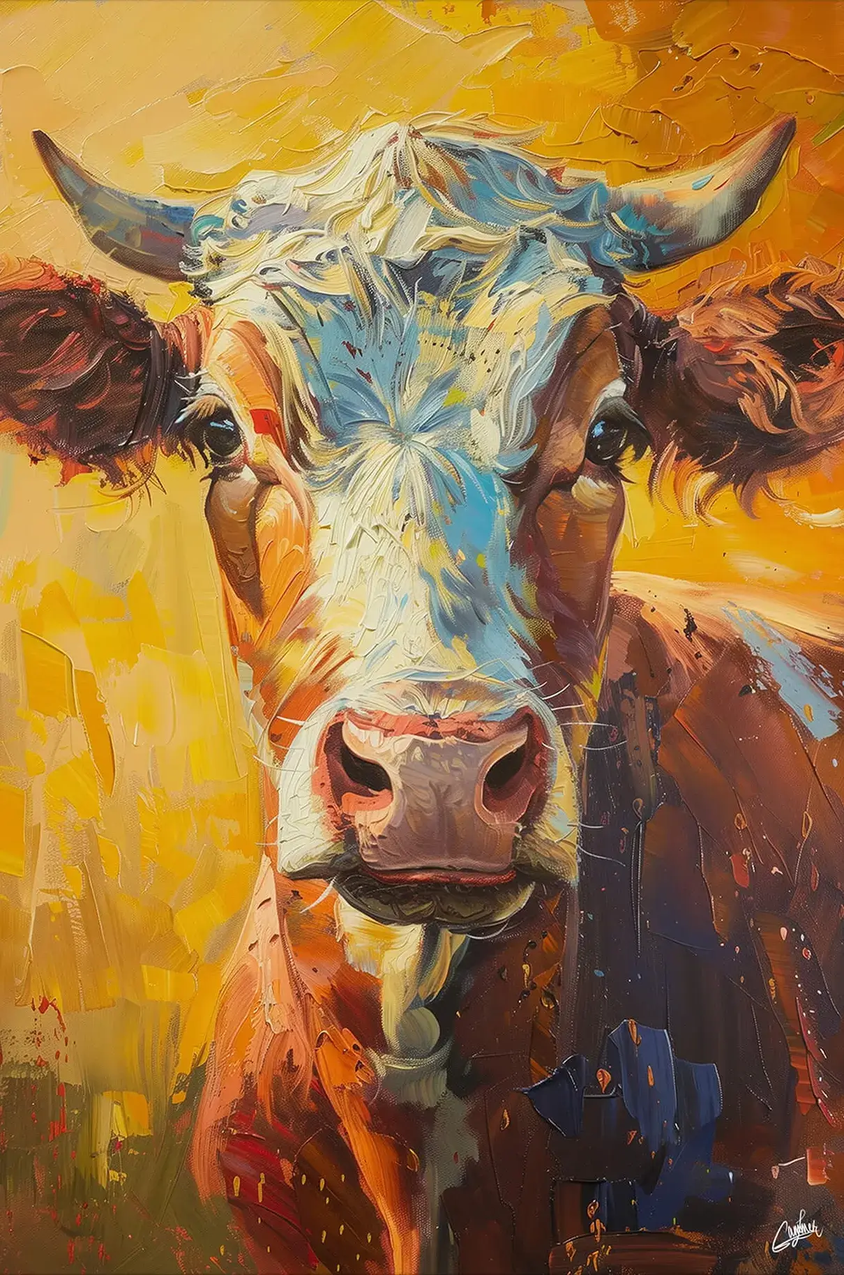The artwork “Bessie” by Zenja Gammer captures the serene charm of a cow bathed in vibrant hues. A symphony of colorful tones comes alive against a golden backdrop, capturing a spirit of wanderlust and calmness. Such indie artwork turns the ordinary into an extraordinary experience. With its yellow accents, it brings warmth and liveliness to your space. The vertical layout emphasizes the elegant grace of the animal, making it a perfect piece of animal wall art for your collection.