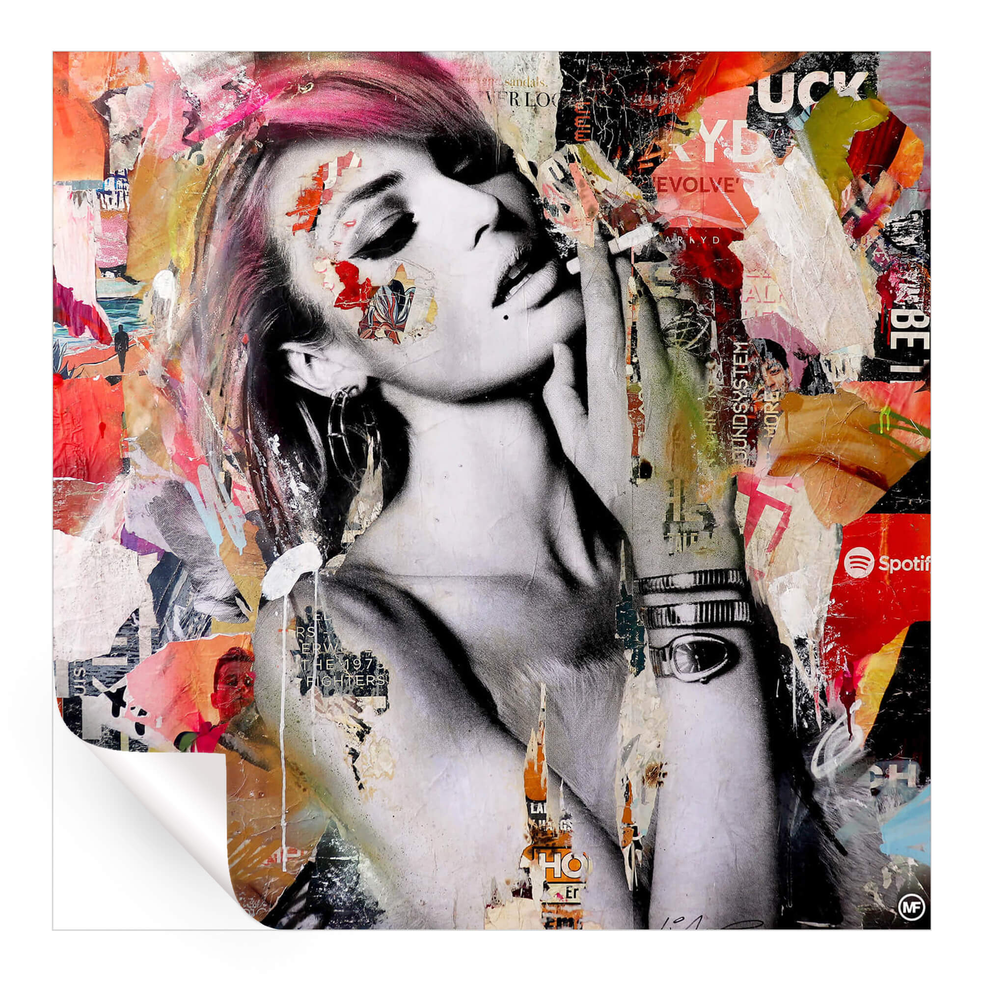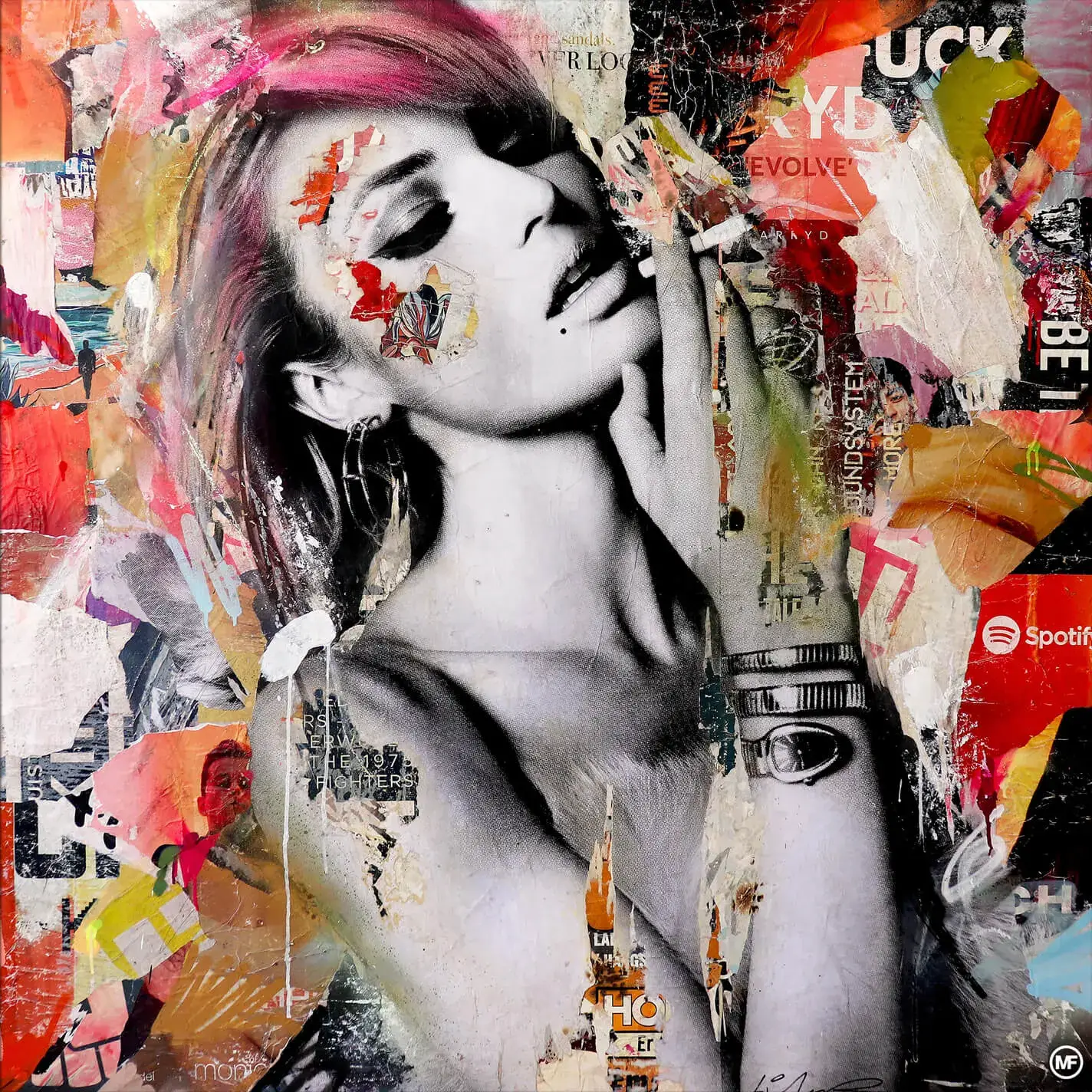 Michiel Folkers is a mixed media artist living and working in Amsterdam. He is best known for his layered paintings, large canvases in which he combines colorful street posters with spray paint and acrylics.