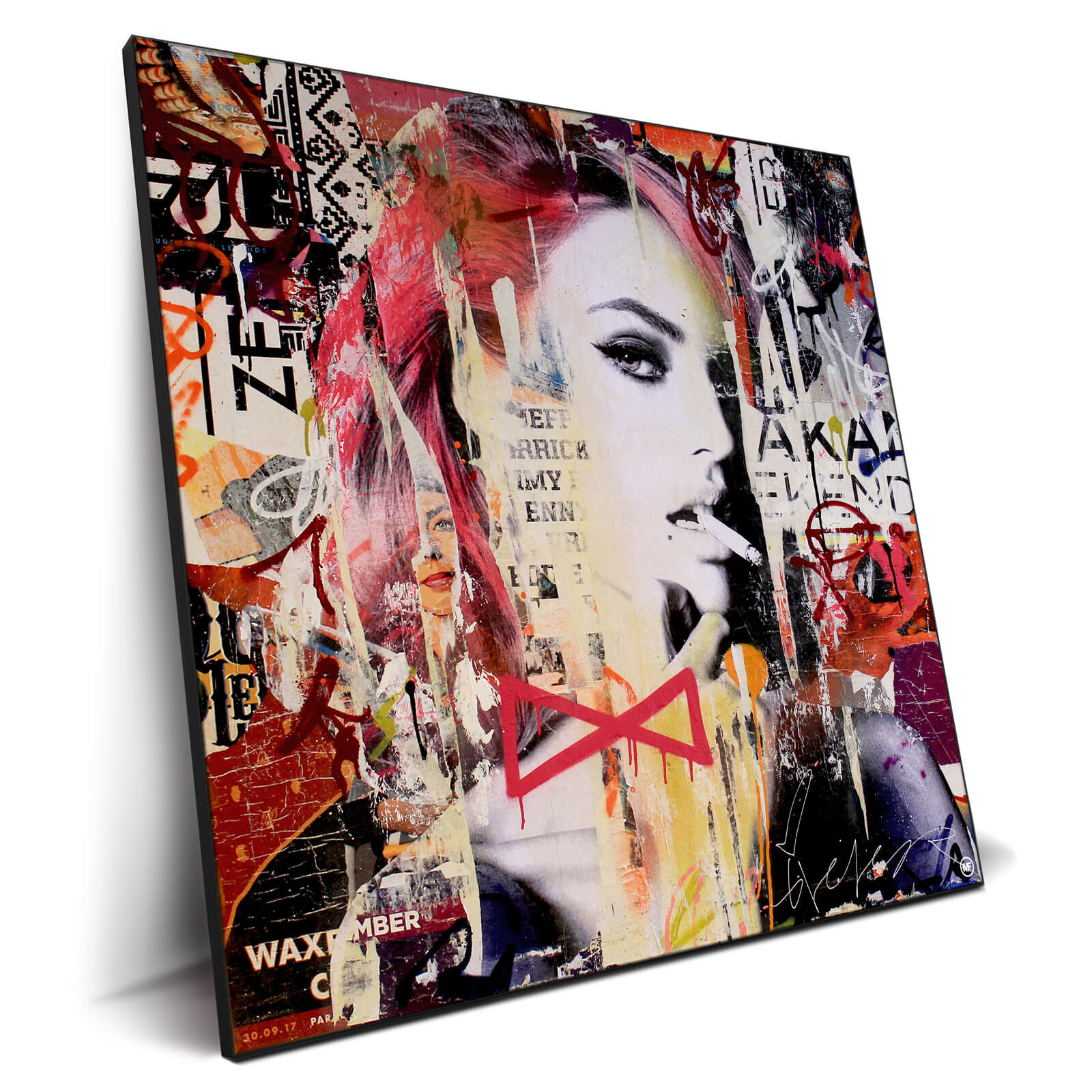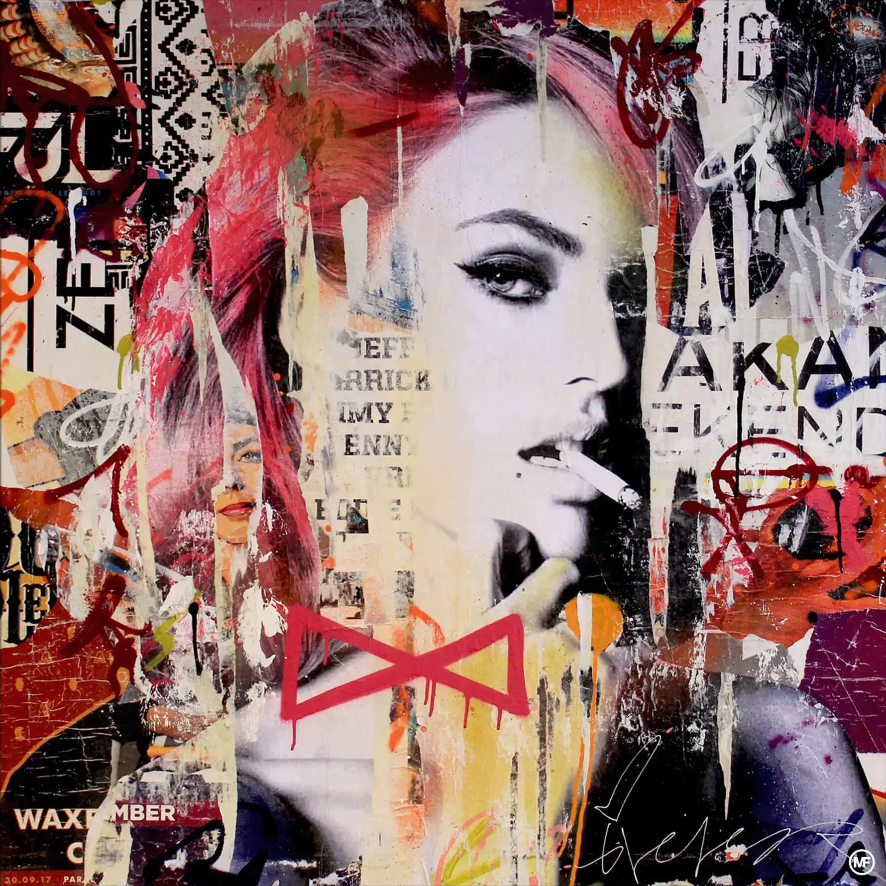 Her image, juxtaposed with vibrant street art elements, captures the essence of contemporary beauty against the rawness of city life. The artwork’s collage style creates depth and complexity, reflecting the multifaceted nature of modern femininity.