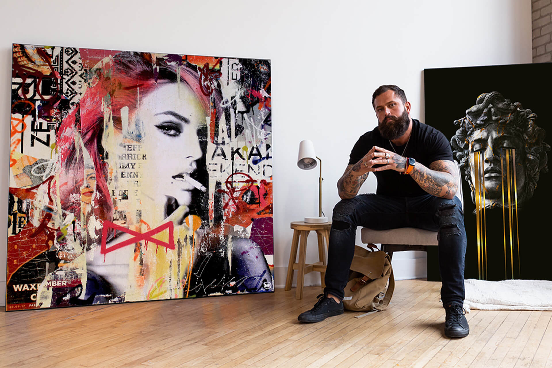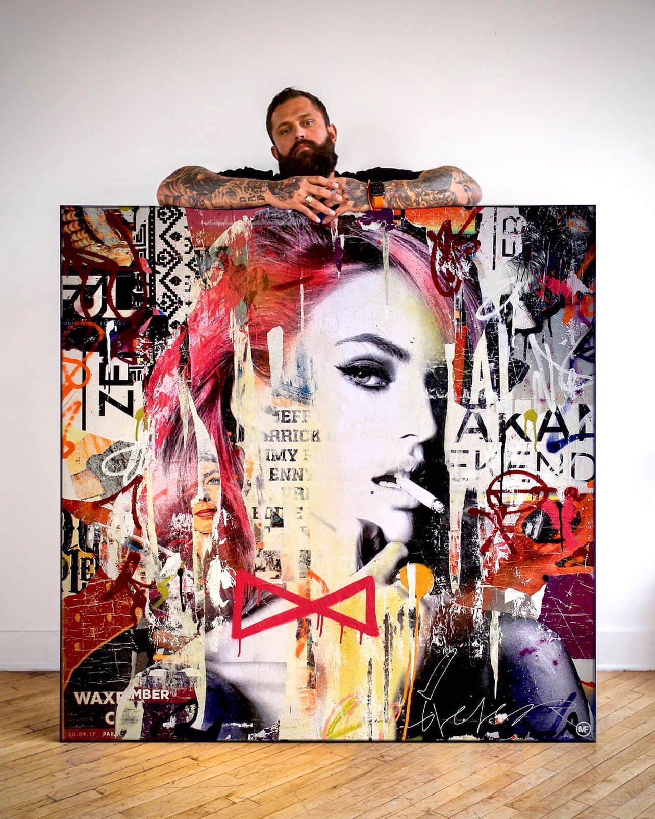 Michiel Folkers is a mixed media artist living and working in Amsterdam. He is best known for his layered paintings, large canvases in which he combines colorful street posters with spray paint and acrylics.