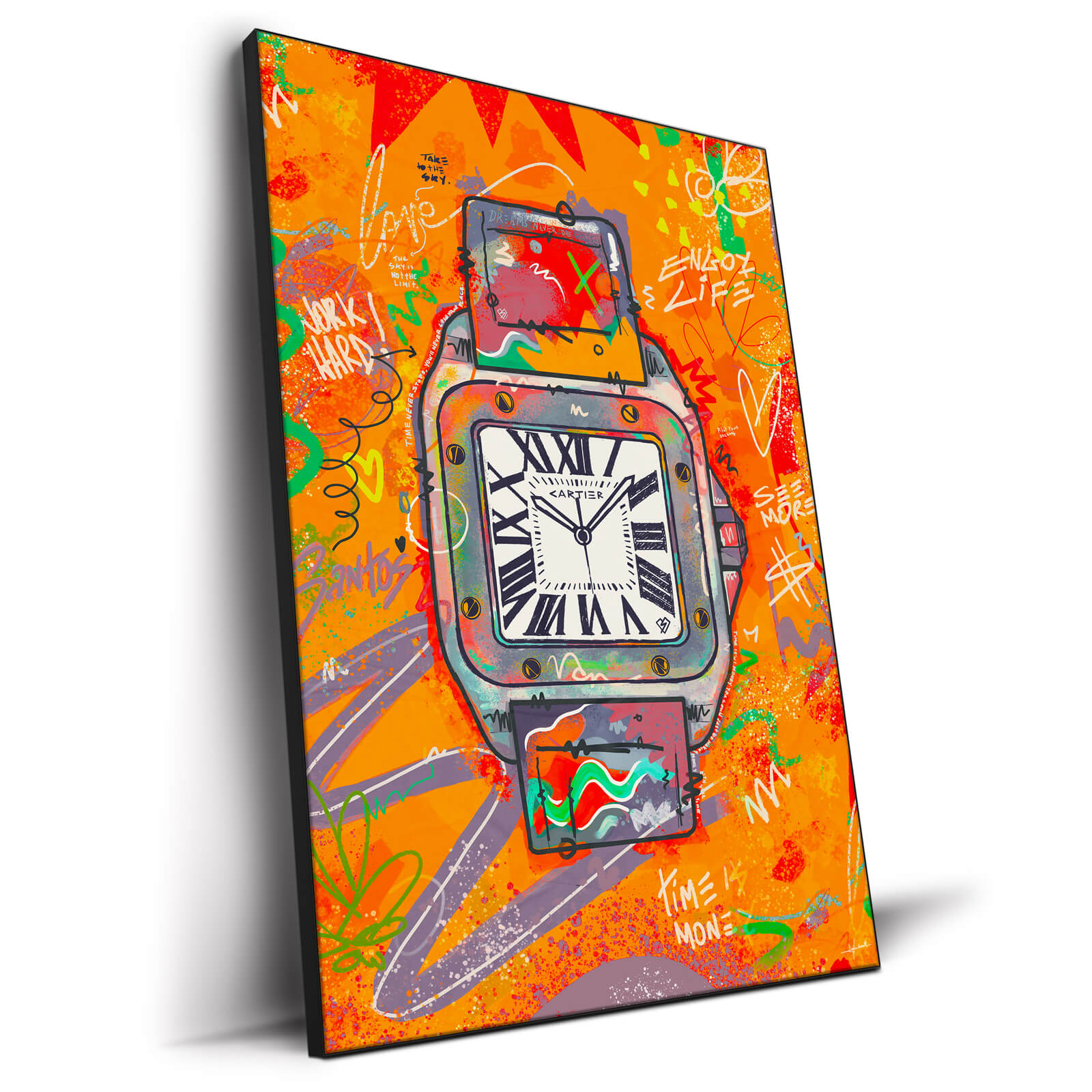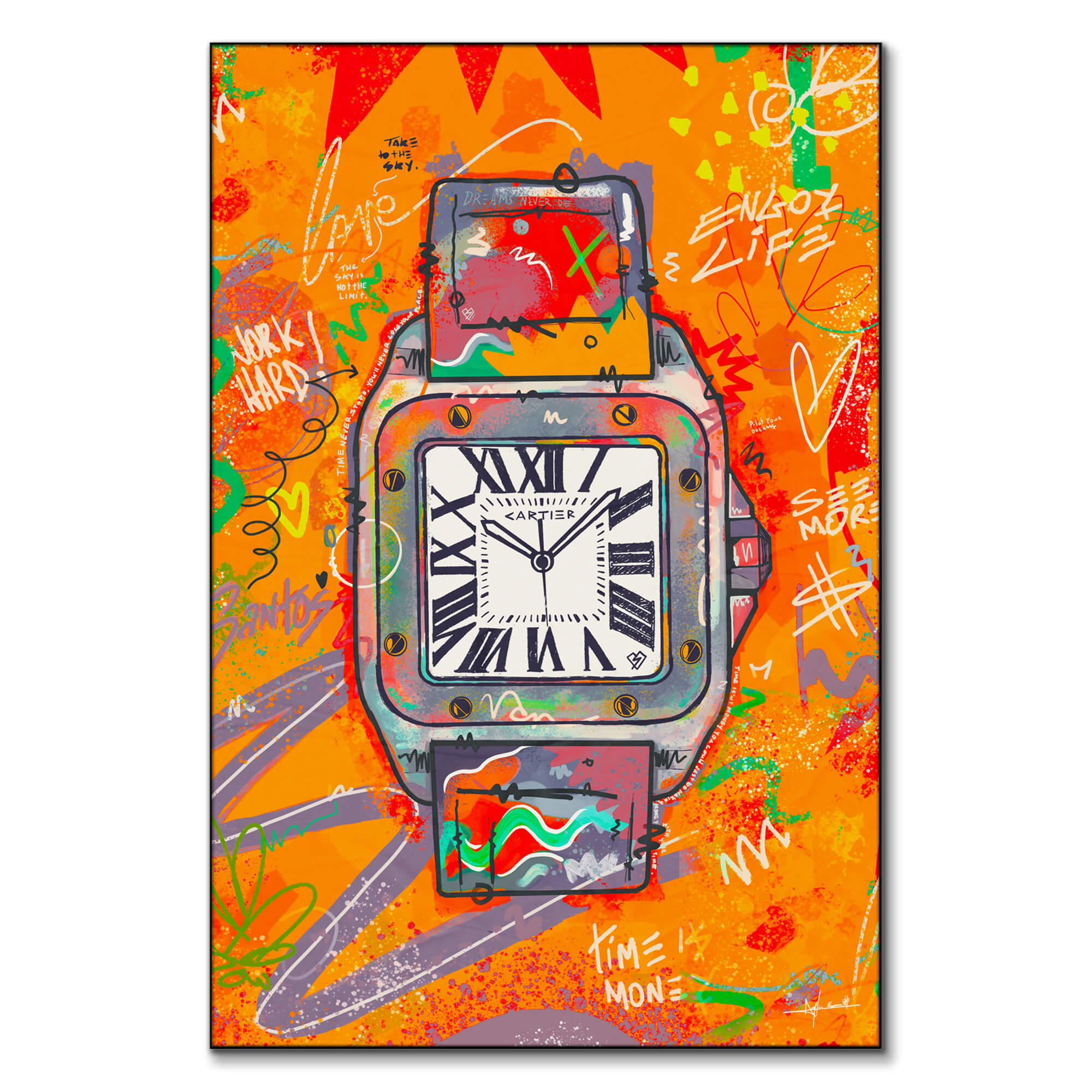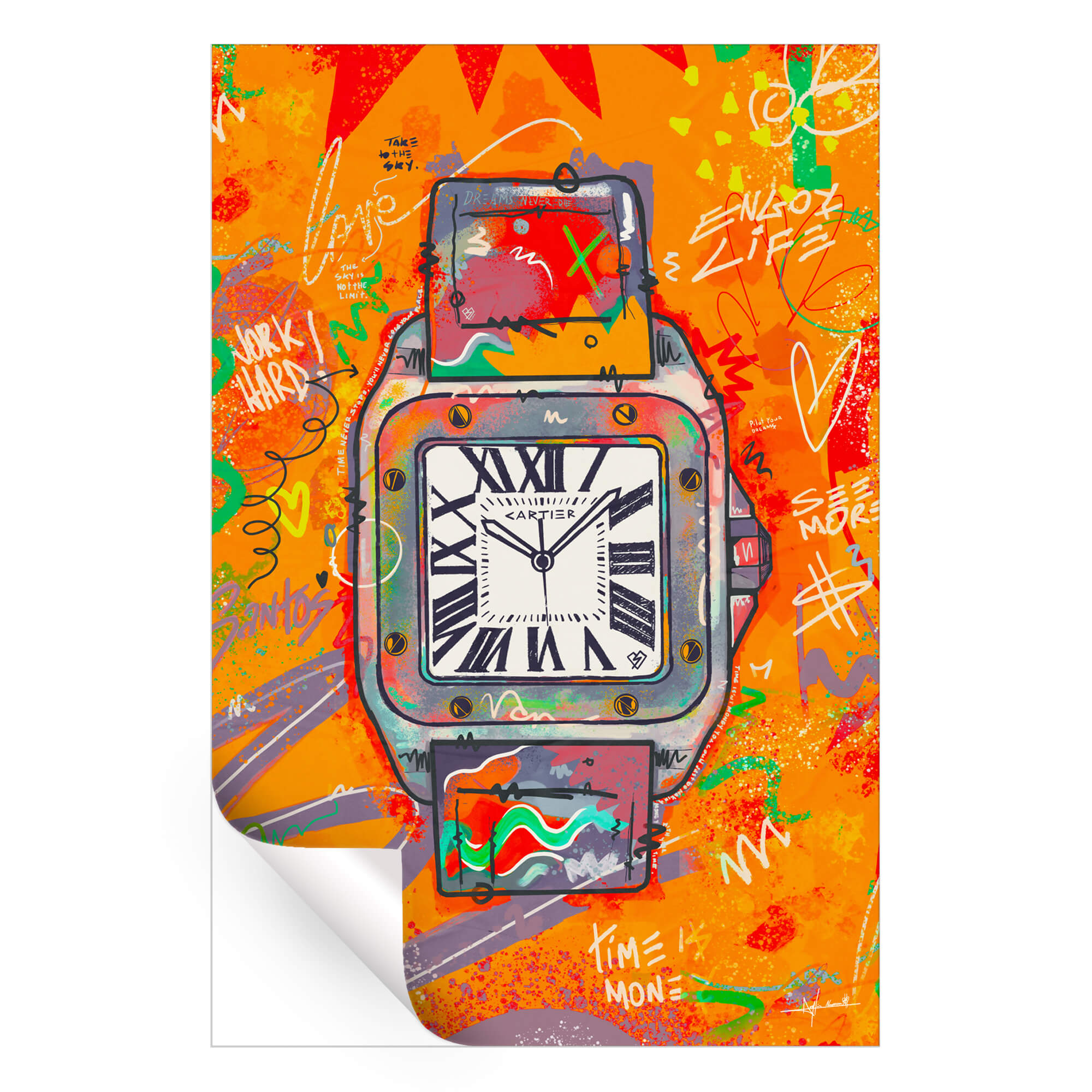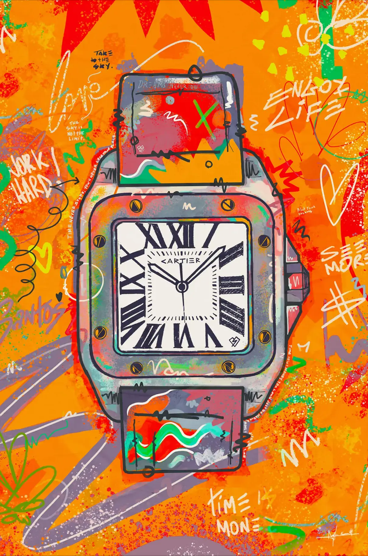 A Cartier watch is showcased amidst a vibrant, graffiti-style backdrop full of vivid splashes of orange and dynamic scribbles, conveying a sense of luxury with an edgy twist.