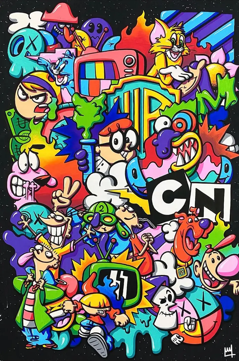 Colorful collage featuring an array of iconic characters from Cartoon Network’s classic shows. The composition is a riot of color, with each character captured in a moment of animated expression or action. Recognizable figures from “Dexter’s Laboratory,” “The Powerpuff Girls,” “Ed, Edd n Eddy,” and others are intermixed with bold, graffiti-style lettering that spells out “CN” for Cartoon Network. The black background is speckled with stars, giving the impression that these beloved characters are set against the vastness of space.