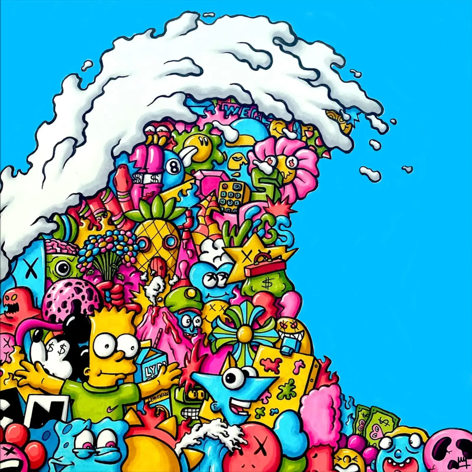 A tsunami of color and characters cascades over this playful image, where iconic figures from pop culture and animation merge into a vibrant wave. Recognizable faces, such as Bart Simpson, mix with emotive creatures and various symbols to create a lively, eclectic scene. The crest of the wave is pure white, contrasting sharply with the vivid hues beneath, and all set against a bright blue sky which adds to the whimsical nature of this energetic piece.