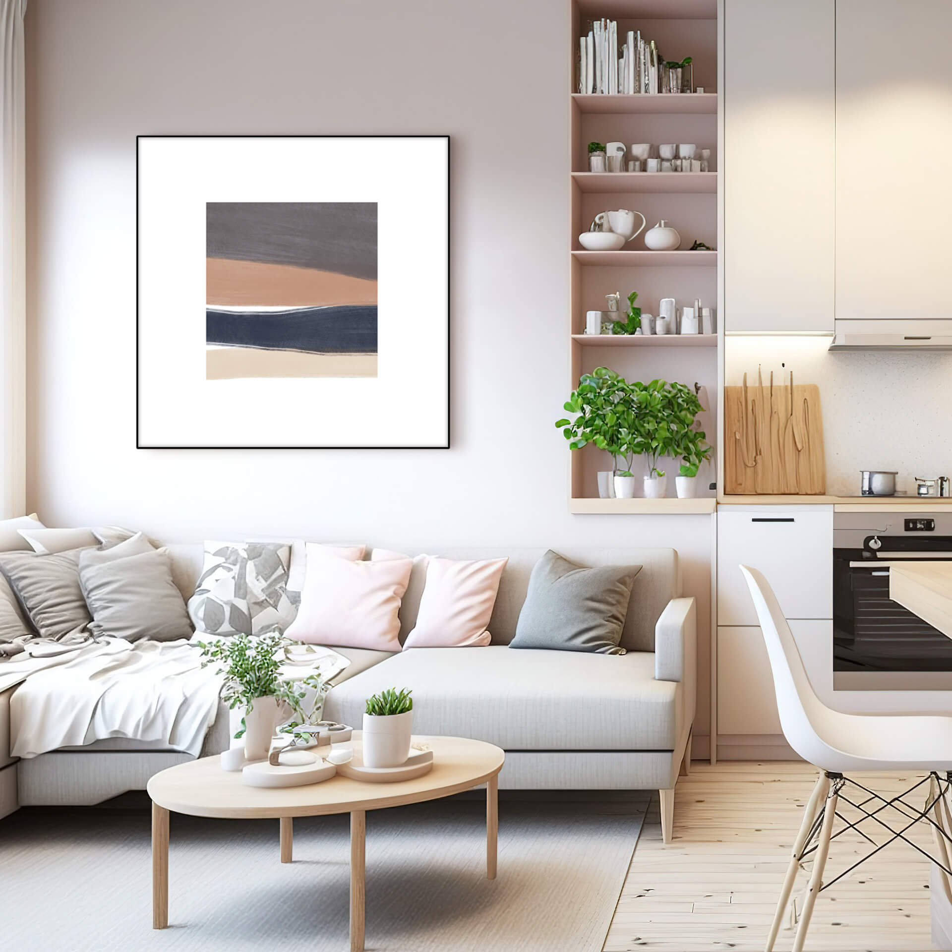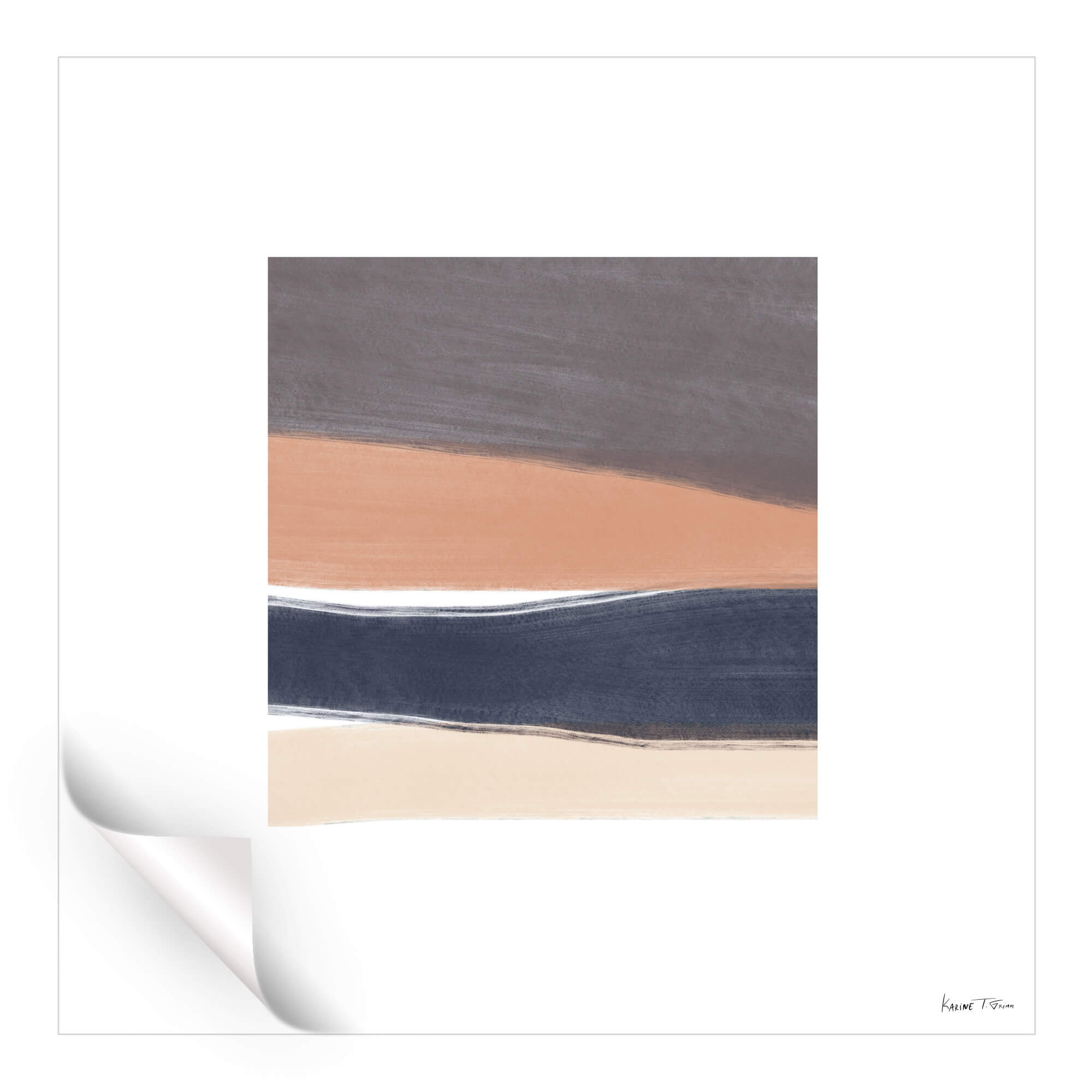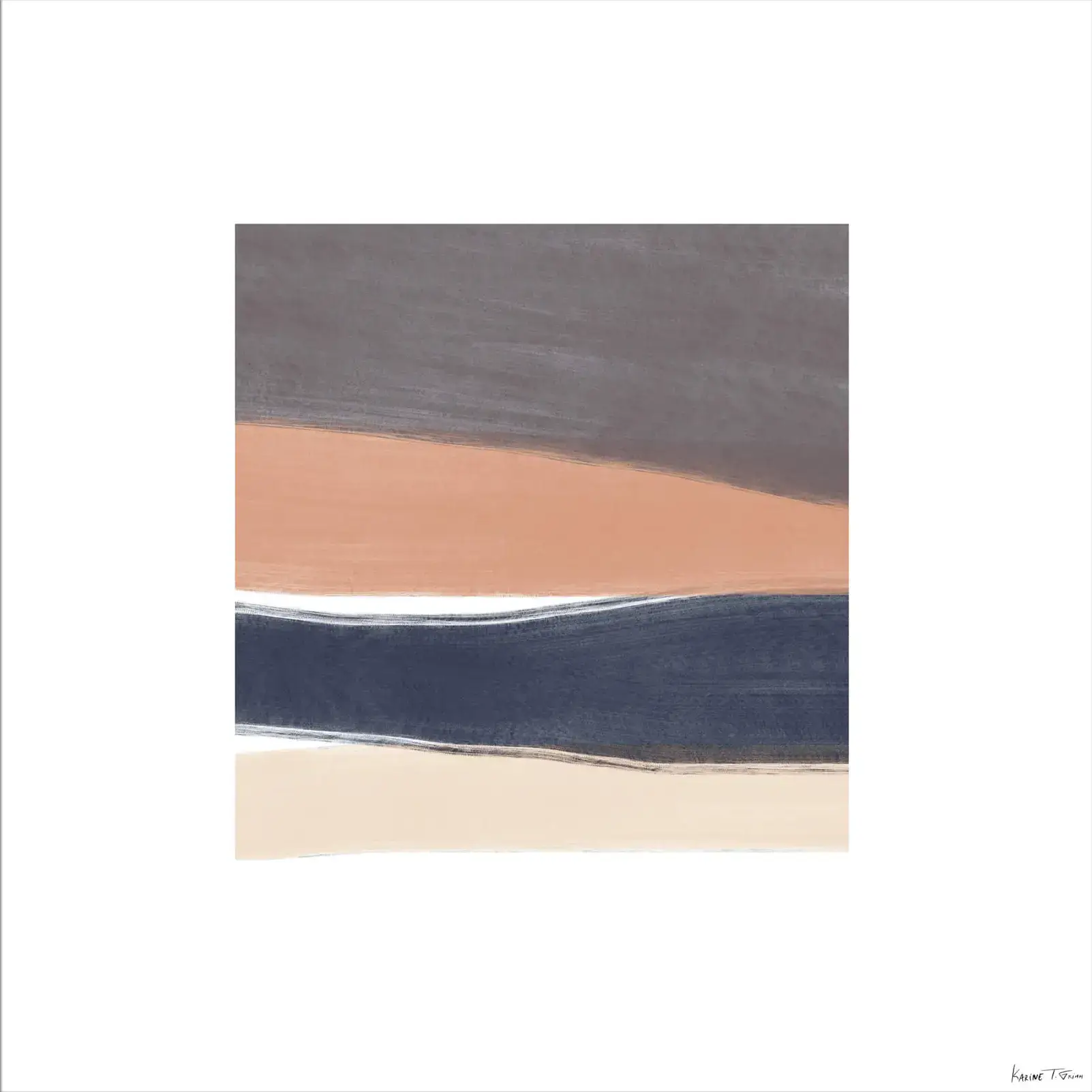 Broad horizontal bands of color create a calm, layered landscape. Charcoal gray dominates the upper portion, followed by a band of warm terracotta, a stripe of navy and concluding with cream. Surrounded by a white expanse, focus is led to the center of the composition. The smoothness of the bands gives a sense of tranquility, reminiscent of the horizon at dusk where the sky meets the earth and sea, captured in a moment of stillness.