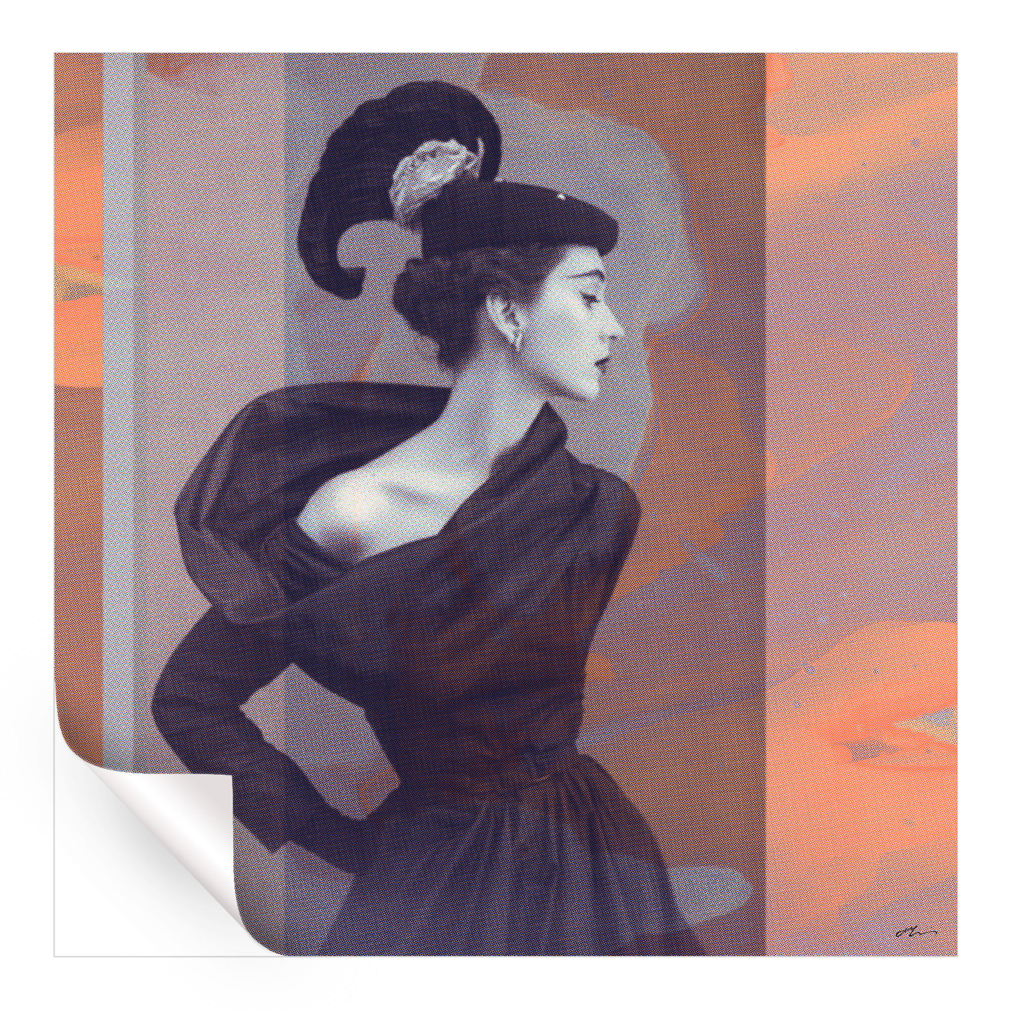 She wears a hat with a plume, adding to the sophistication of her ensemble. The abstract background, with its soft peach and muted grey tones, complements the classic and stately mood conveyed by her attire and demeanor.