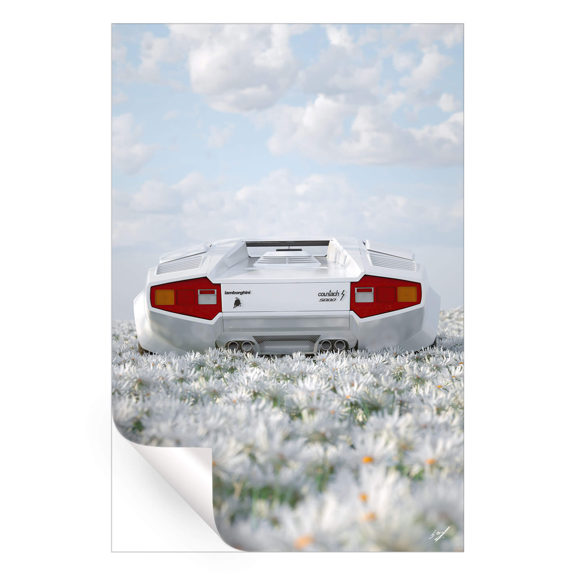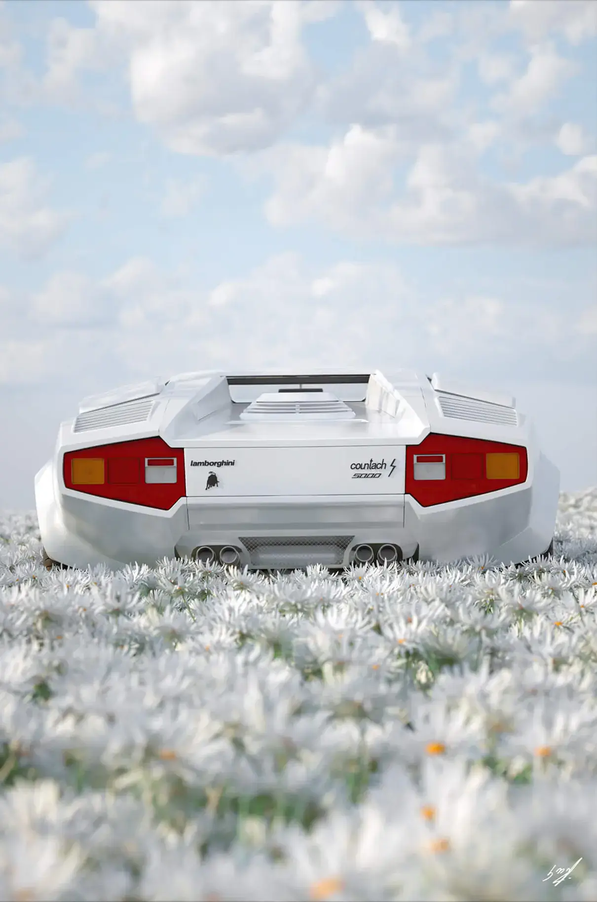 The Lamborghini Countach’s pristine white exterior mirrors the surrounding field of daisies, with light blue sky and clouds above, reflecting off its surface.